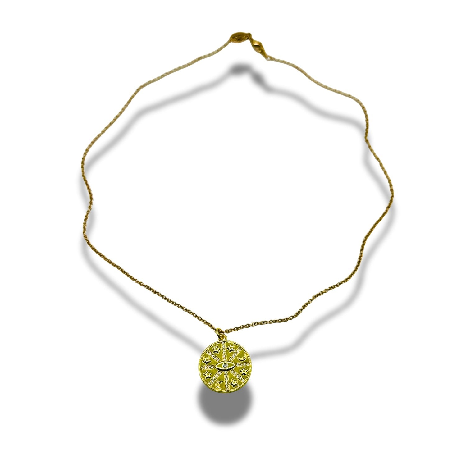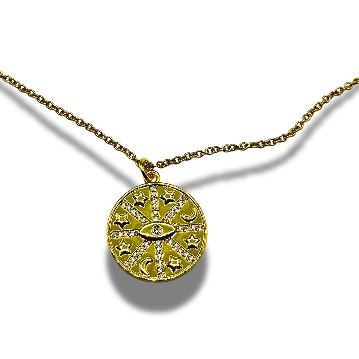 Carry a world of meaning close to your heart. This unique pendant brings together powerful symbols: a lightning bolt for strength, a rainbow for hope, the moon for intuition, a heart for love, and a star for guidance. At the center shines the protective evil eye, surrounded by sparkling CZ stones that add just the right amount of light. Suspended from an 18" chain, this necklace is both beautiful and meaningful—perfect for layering or wearing as your everyday talisman.All Symbols Evil Eye Pendant Necklace.
