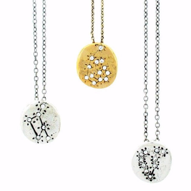 - Approx. 1/2" x 9/16" constellation pendant (pewter base)