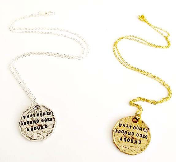 Our What Goes Around Comes Around/ Karma Necklace is a beautiful piece of jewelry that speaks to your beliefs. Crafted with a stamped coin, this necklace is the perfect reminder that what we put out into the universe will come back to us. Let this necklace be your reminder that karma is always in our lives.