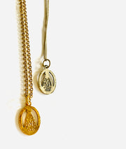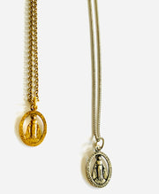 Grace faith-filled looks with the elegant timelessness of this 3/4" religious medal necklace. Crafted from sterling silver or gold plated pewter and an antiqued brass base chain, this beautiful piece comes in 14k gold and sterling silver finishes. With an 18" or 24" adjustable chain, make a statement of faith and style.