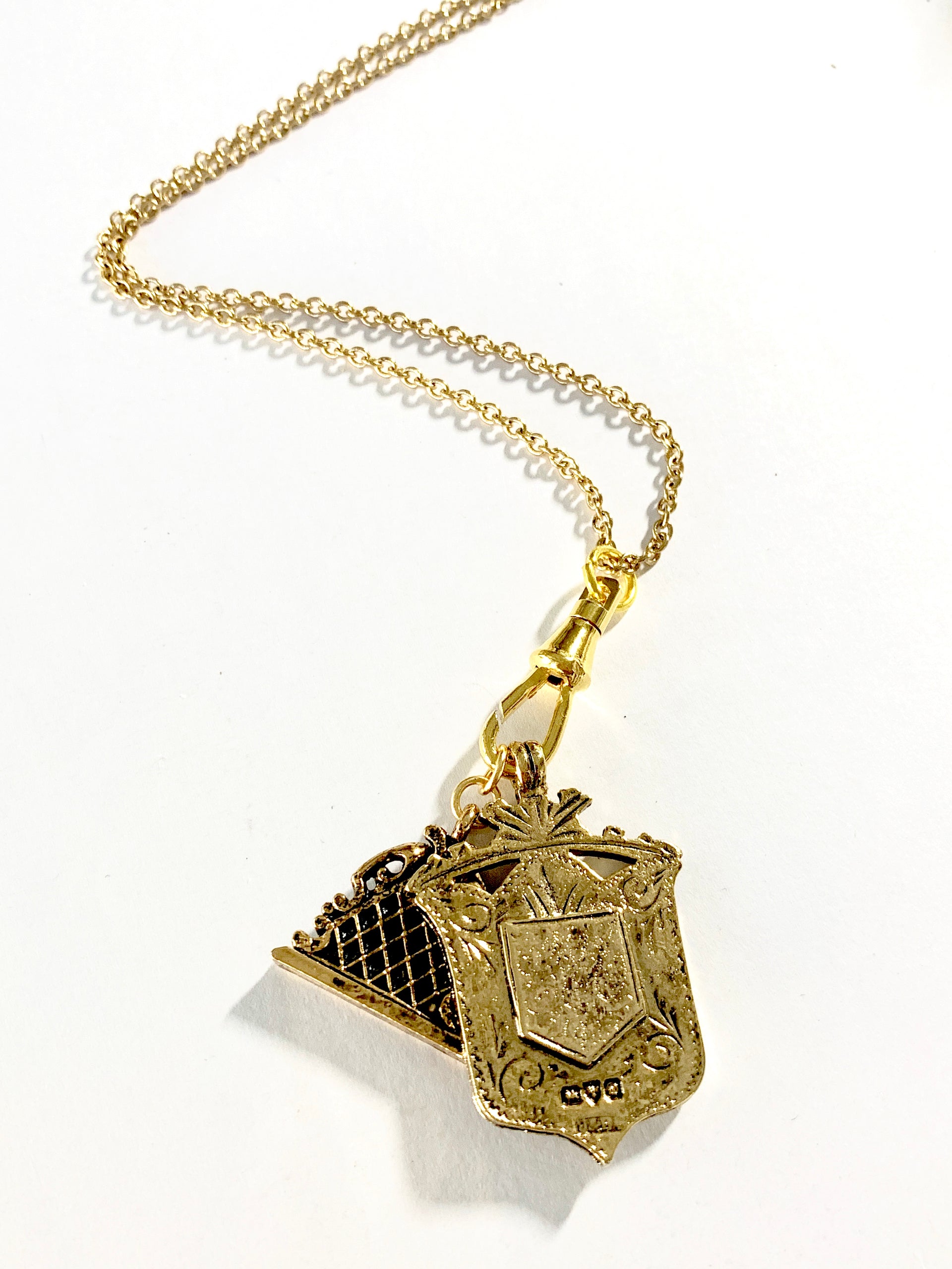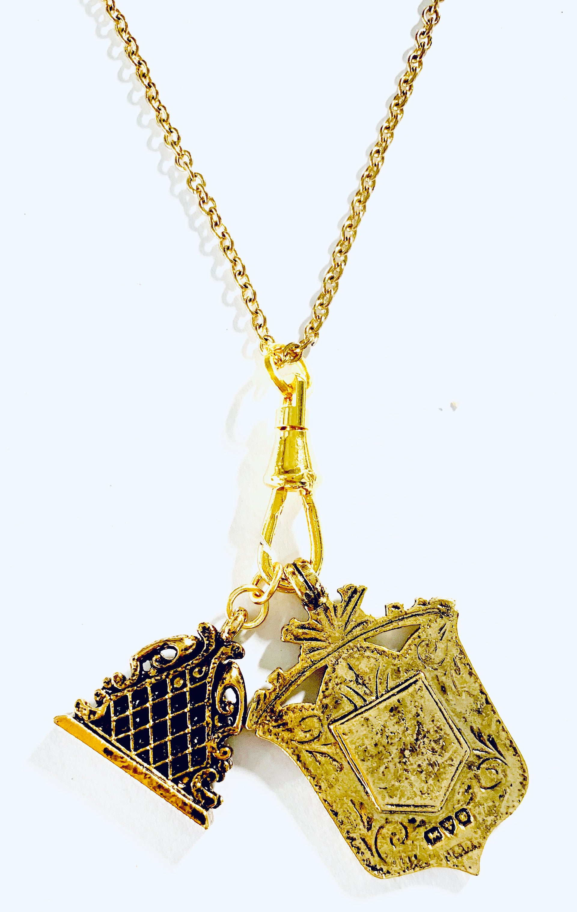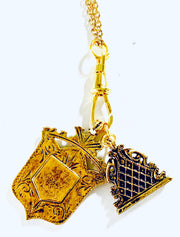This great heirloom piece features a vintage British fob medal and a watch fob on a fob closure. The pendants can be removed and changed out to create your own special creation.