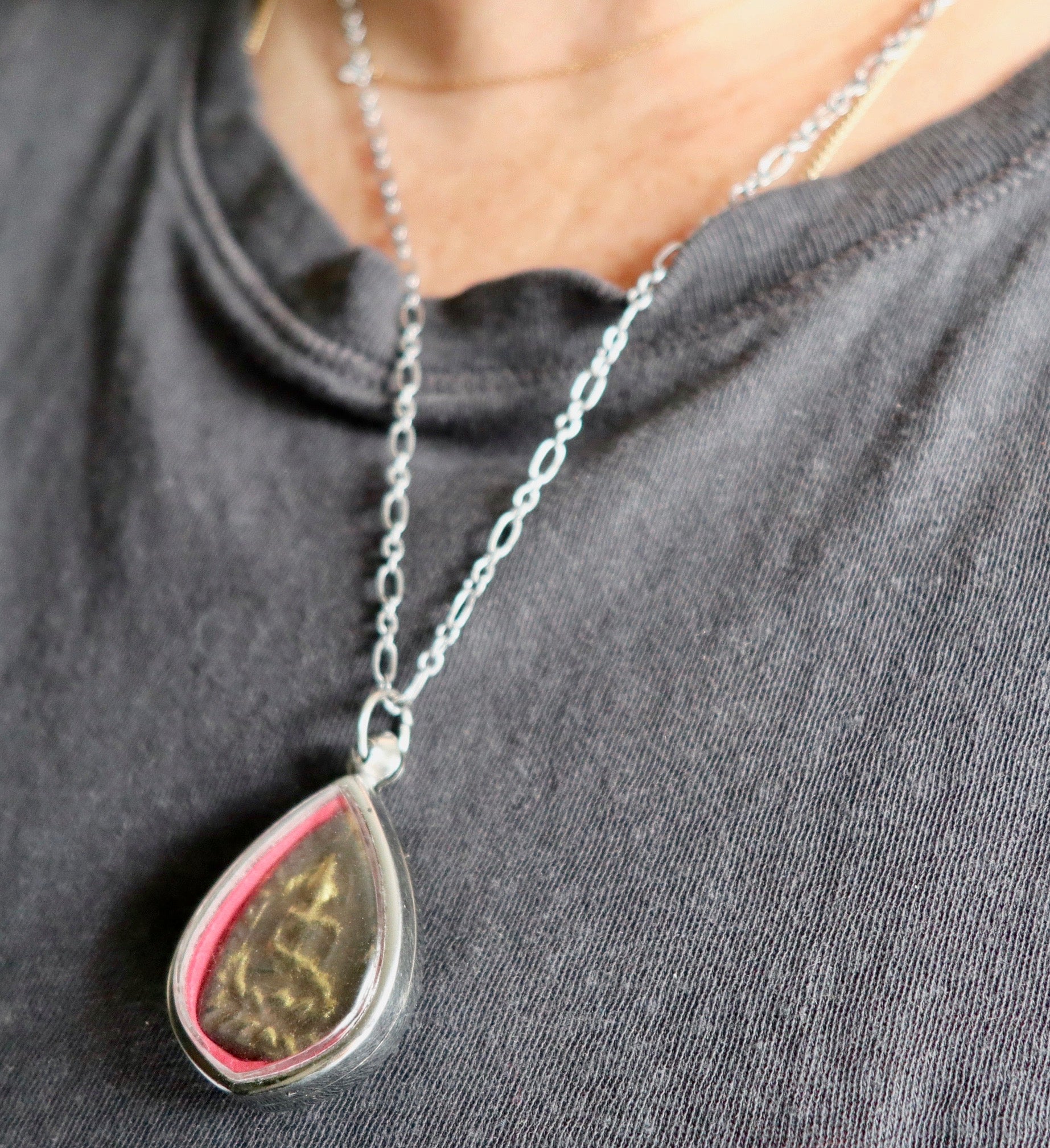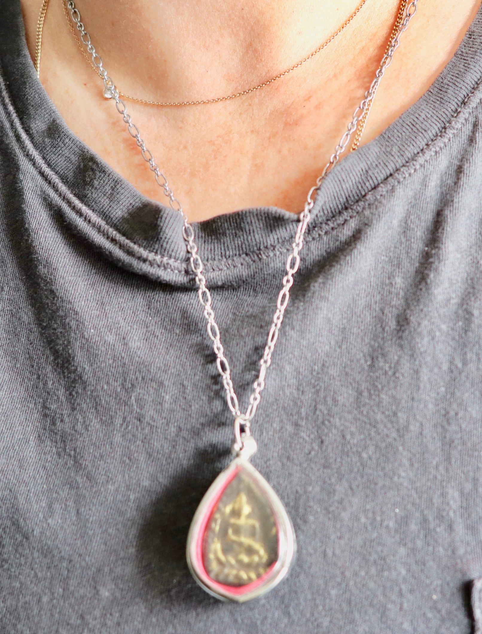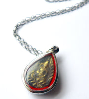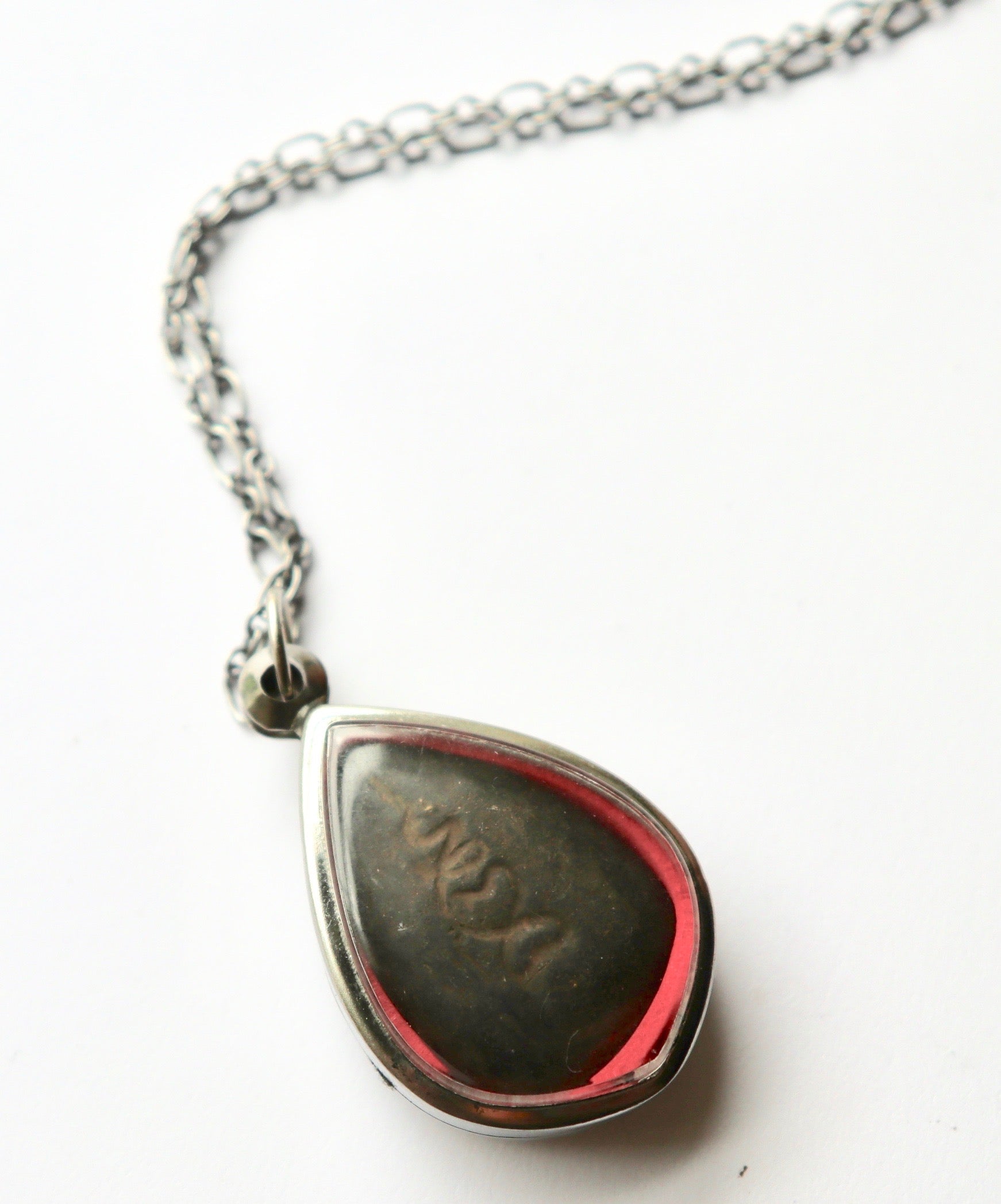 - The Buddha talisman is encased in a plastic and metal case.