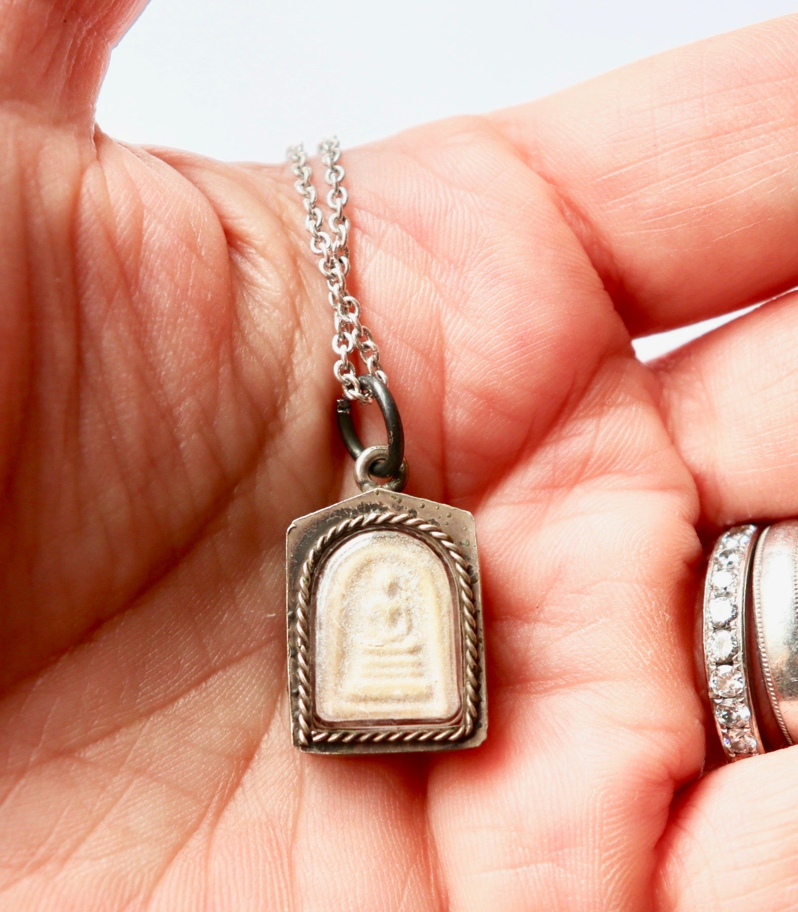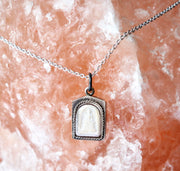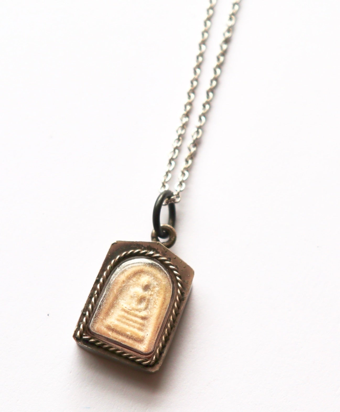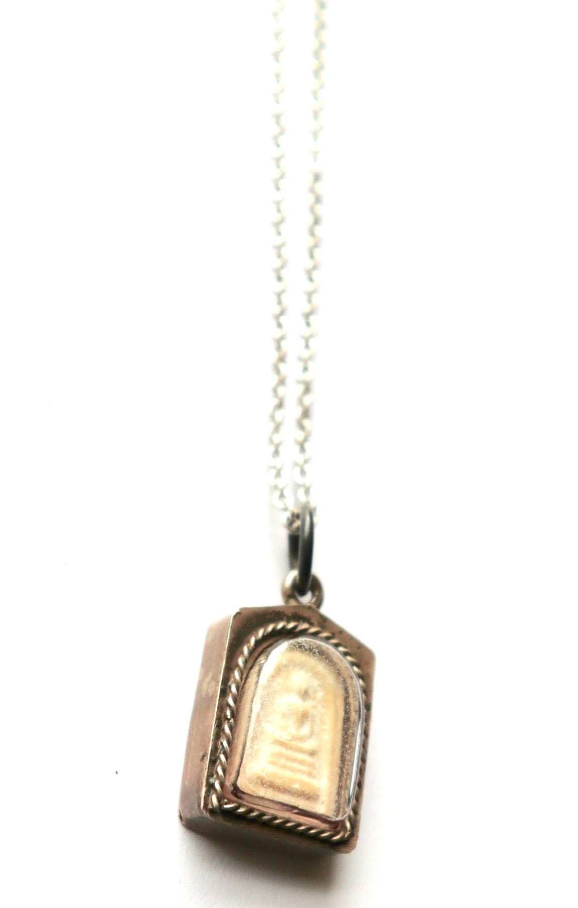 18" chain which is gold sterling silver brass. The pendant measures 1/2" in length 1/2" in width.