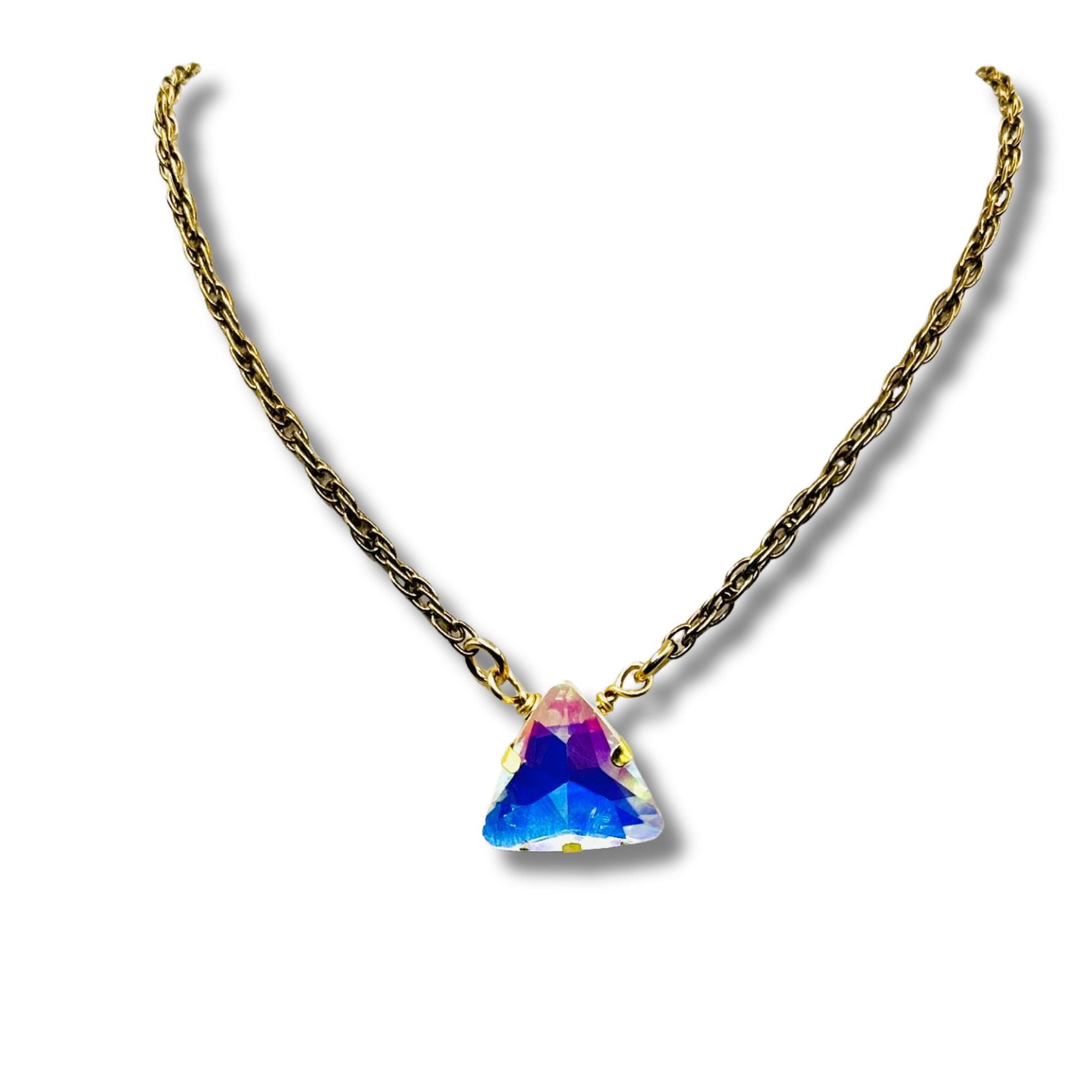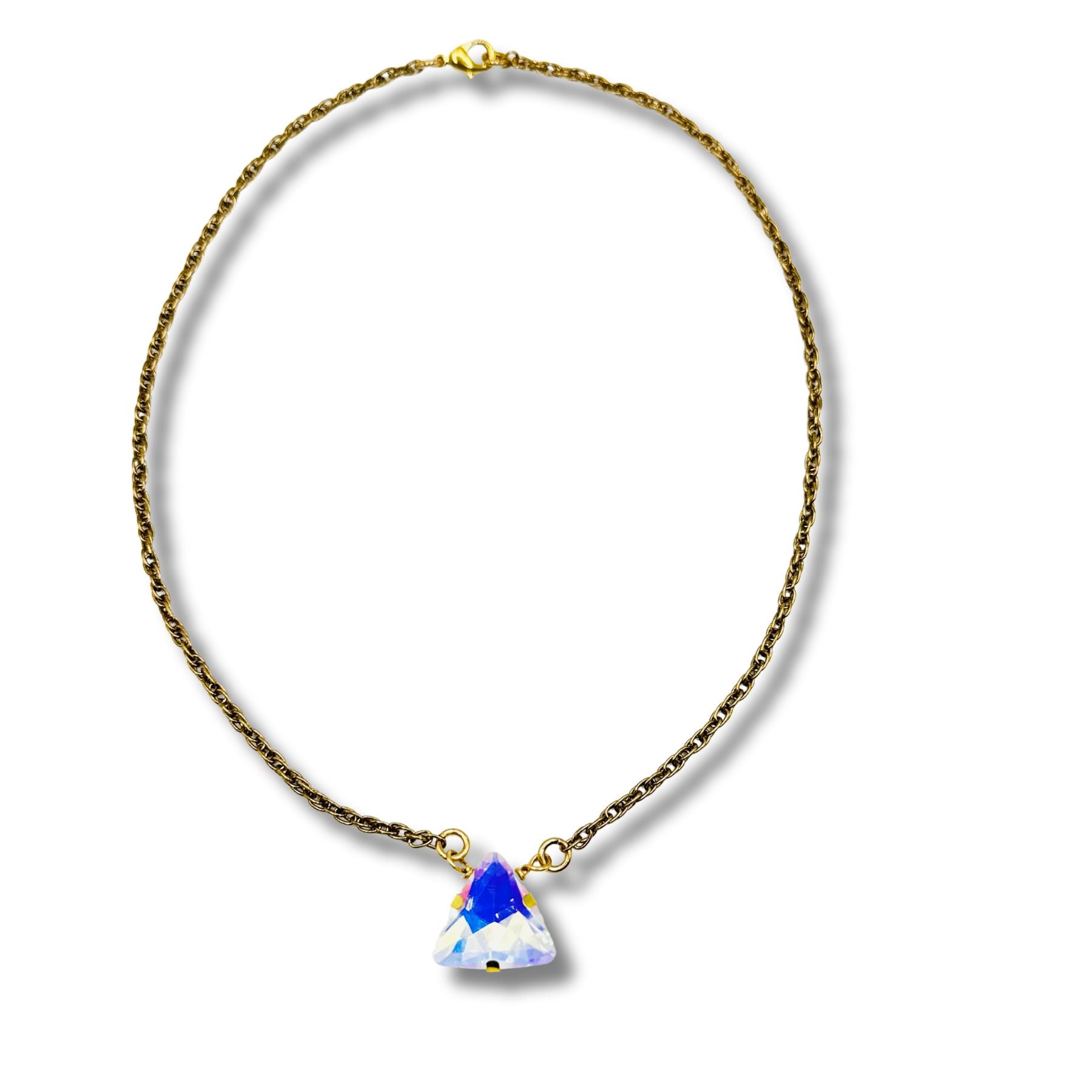 Introducing our AB crystal Rhinestone Gold Statement Necklace, the ultimate accessory for adding a touch of luxury to any outfit. Made with a sparkling AB Crystal Triangle rhinestone, this necklace will make you shine like a diamond. Elevate your style with this elegant and exclusive piece.