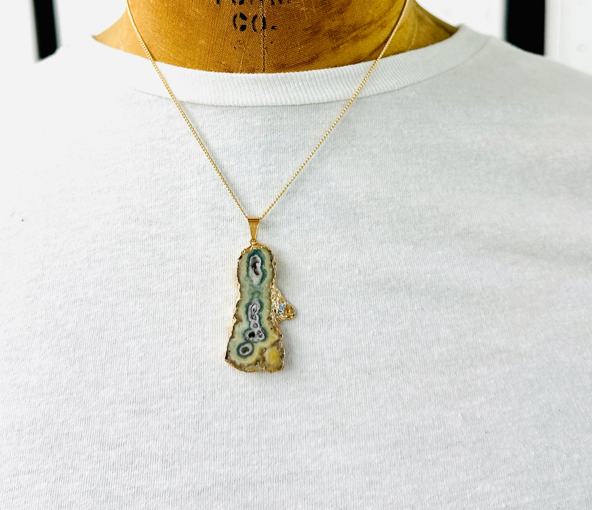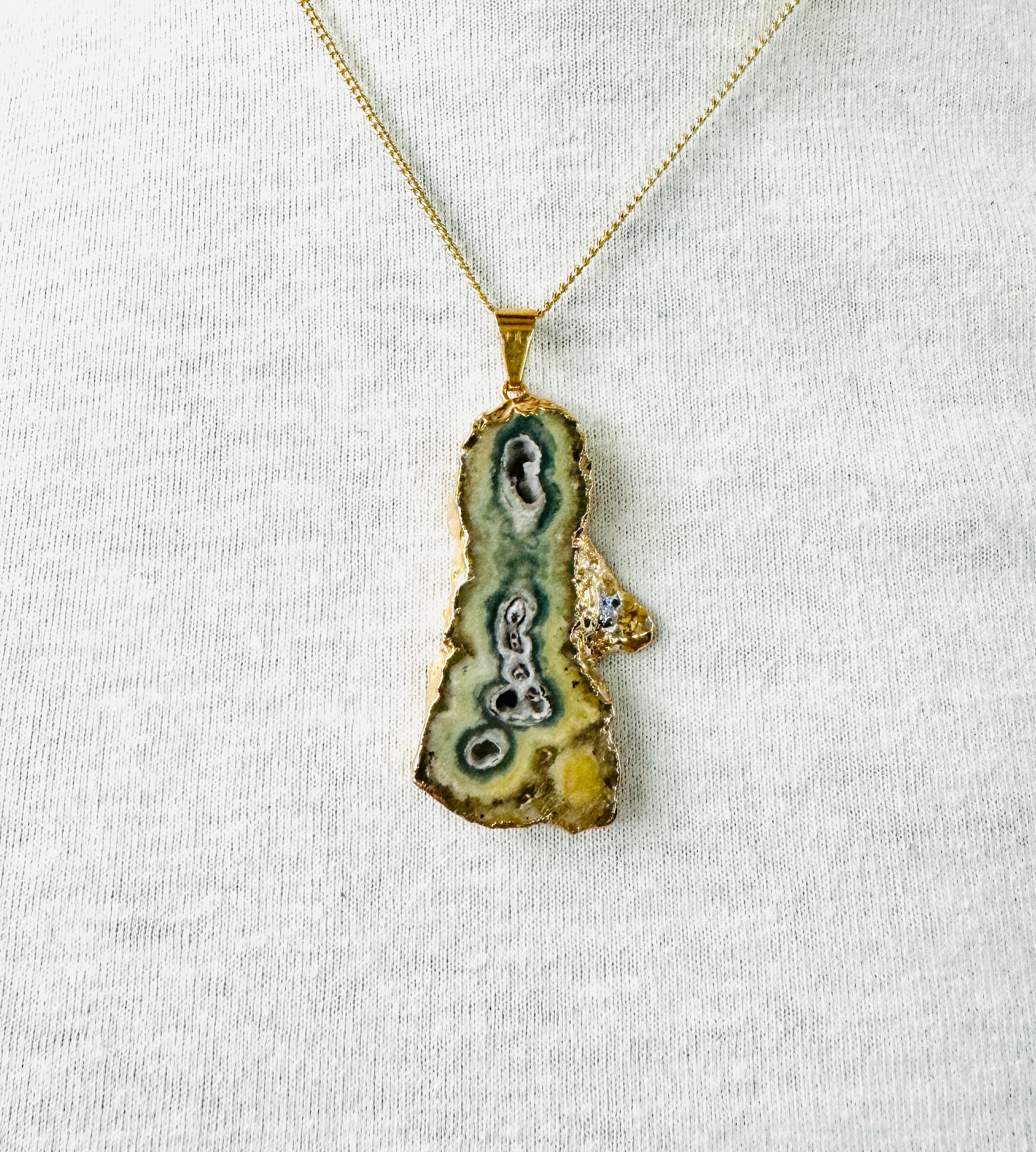 This Beautiful Green Agate Slice Electroformed Necklace is a jaunty companion for your casual wardrobe. Step out in style with the unique blend of colors and textures on this piece, and rock the room! It's a real conversation starter, so you'll be turning heads everywhere you go. Plunder the fashion scene and show your unique style with this one-of-a-kind piece!