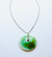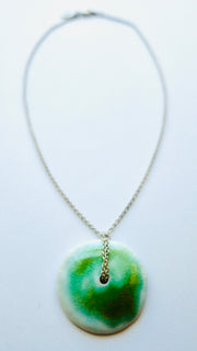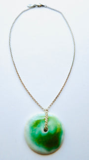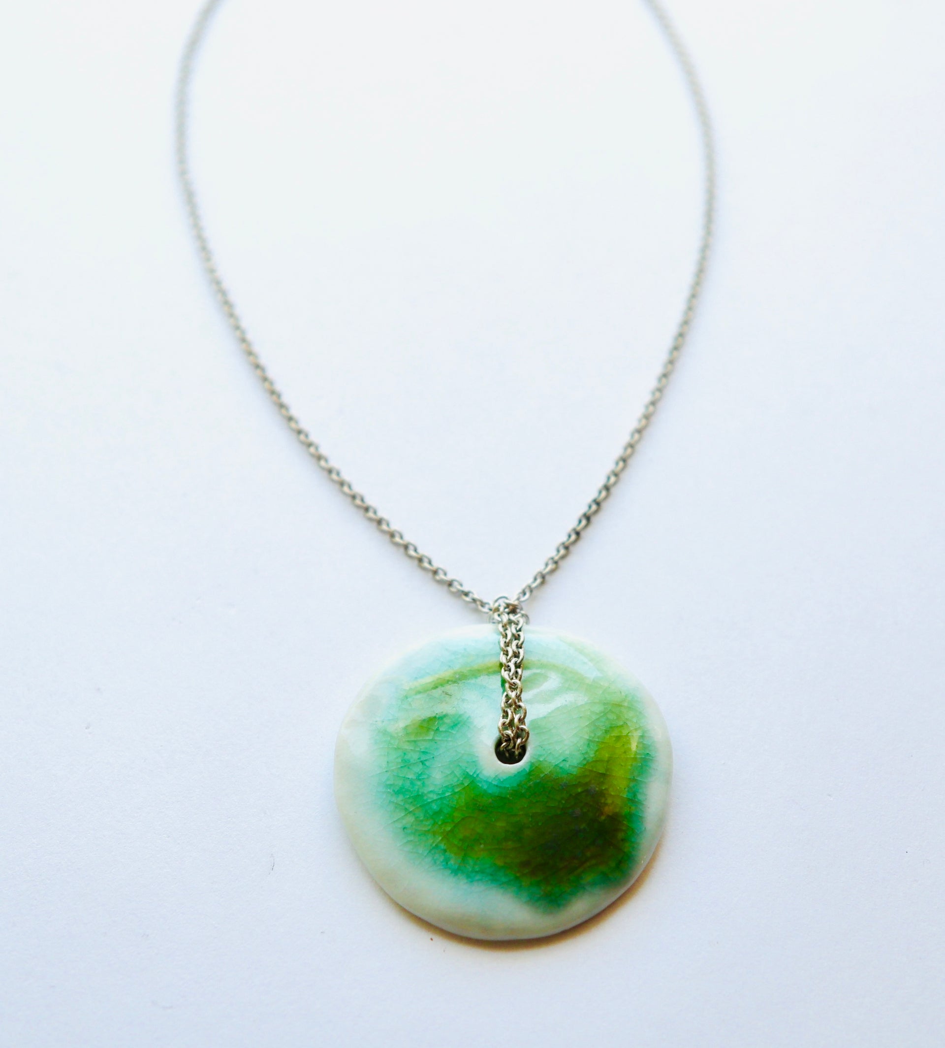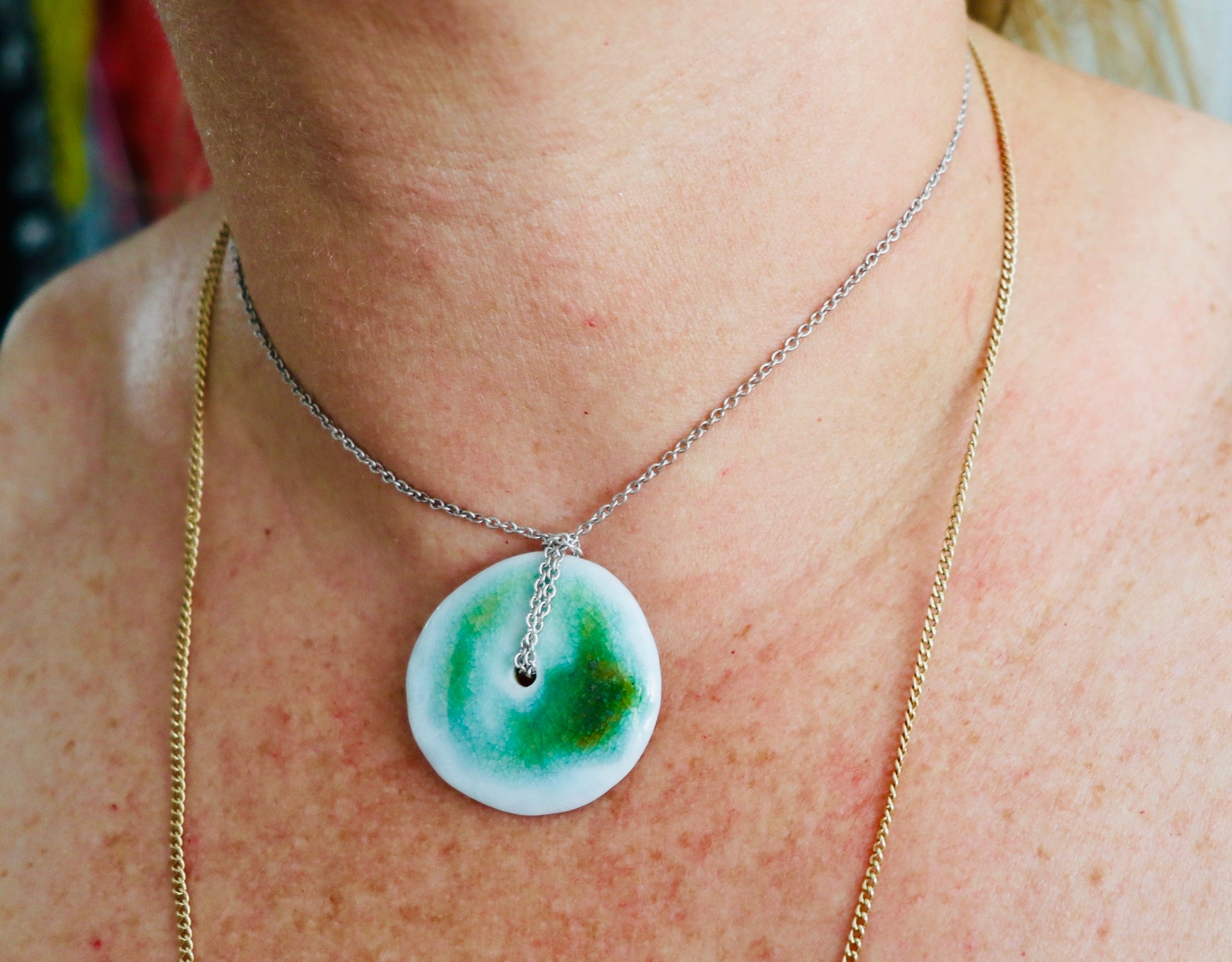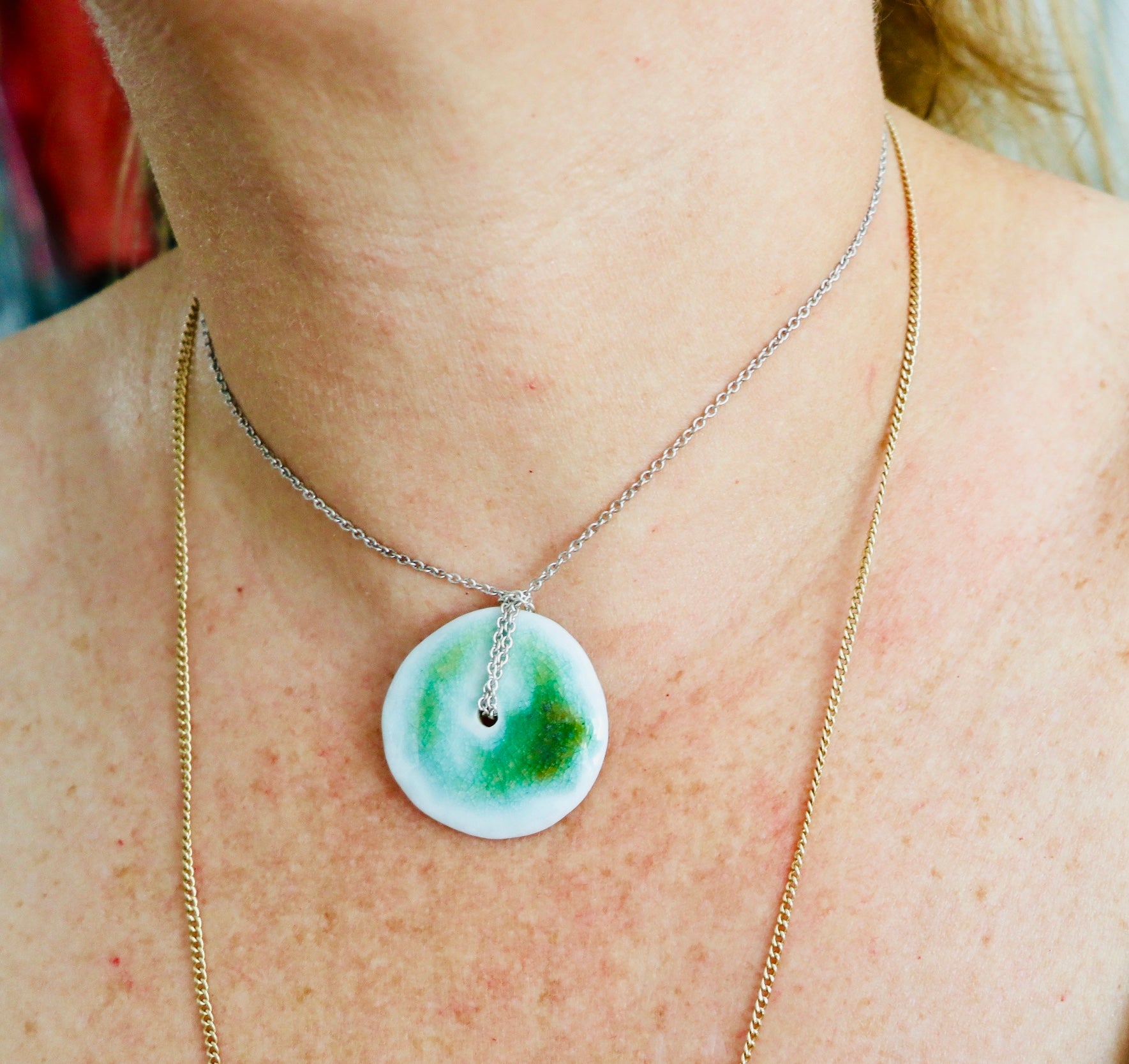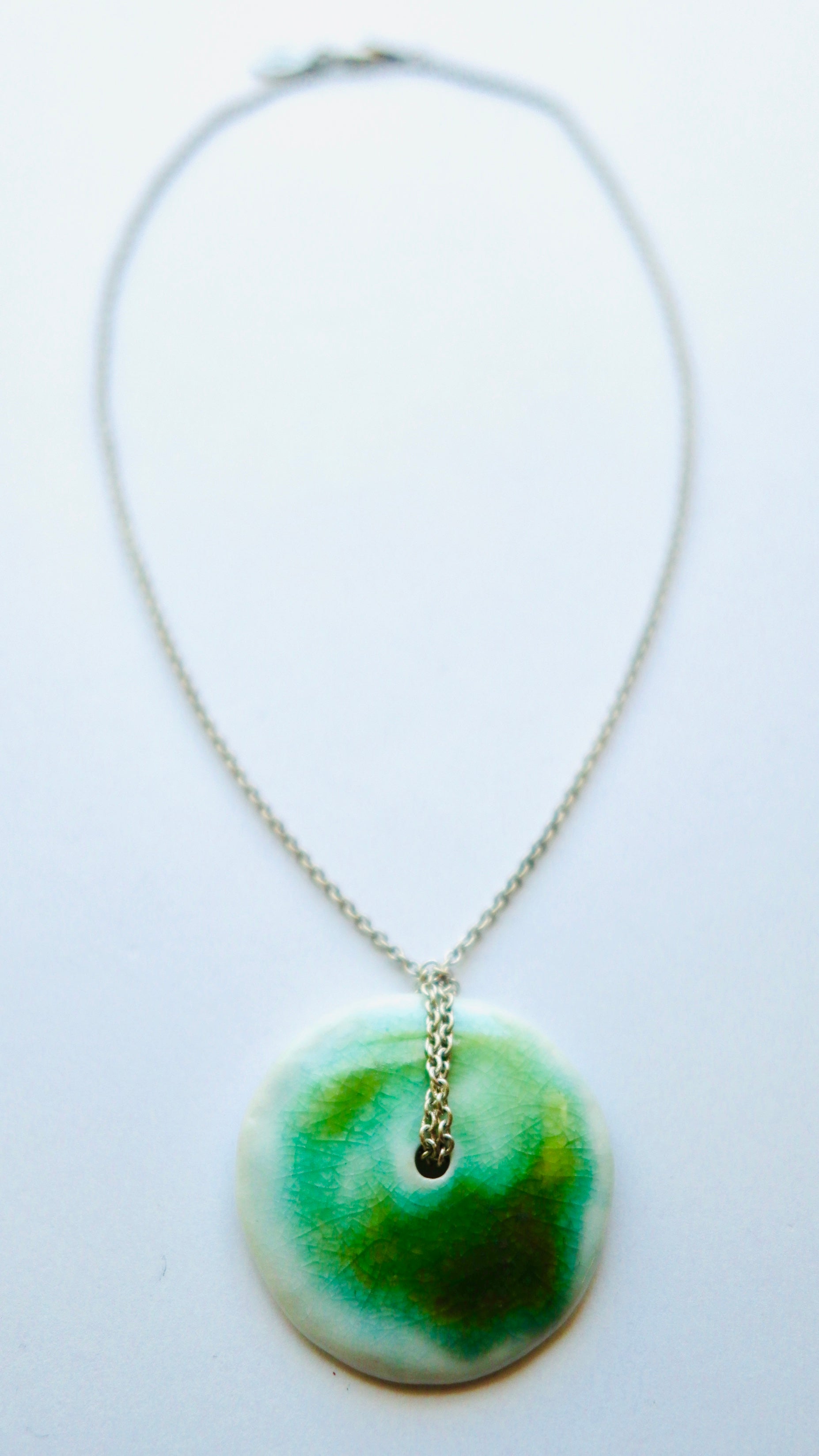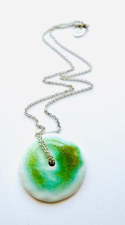 This one of a kind ceramic disc necklace is beautifully simple. This piece can be worn as a choker or a bit longer. There is an extender on the back to extend the length.