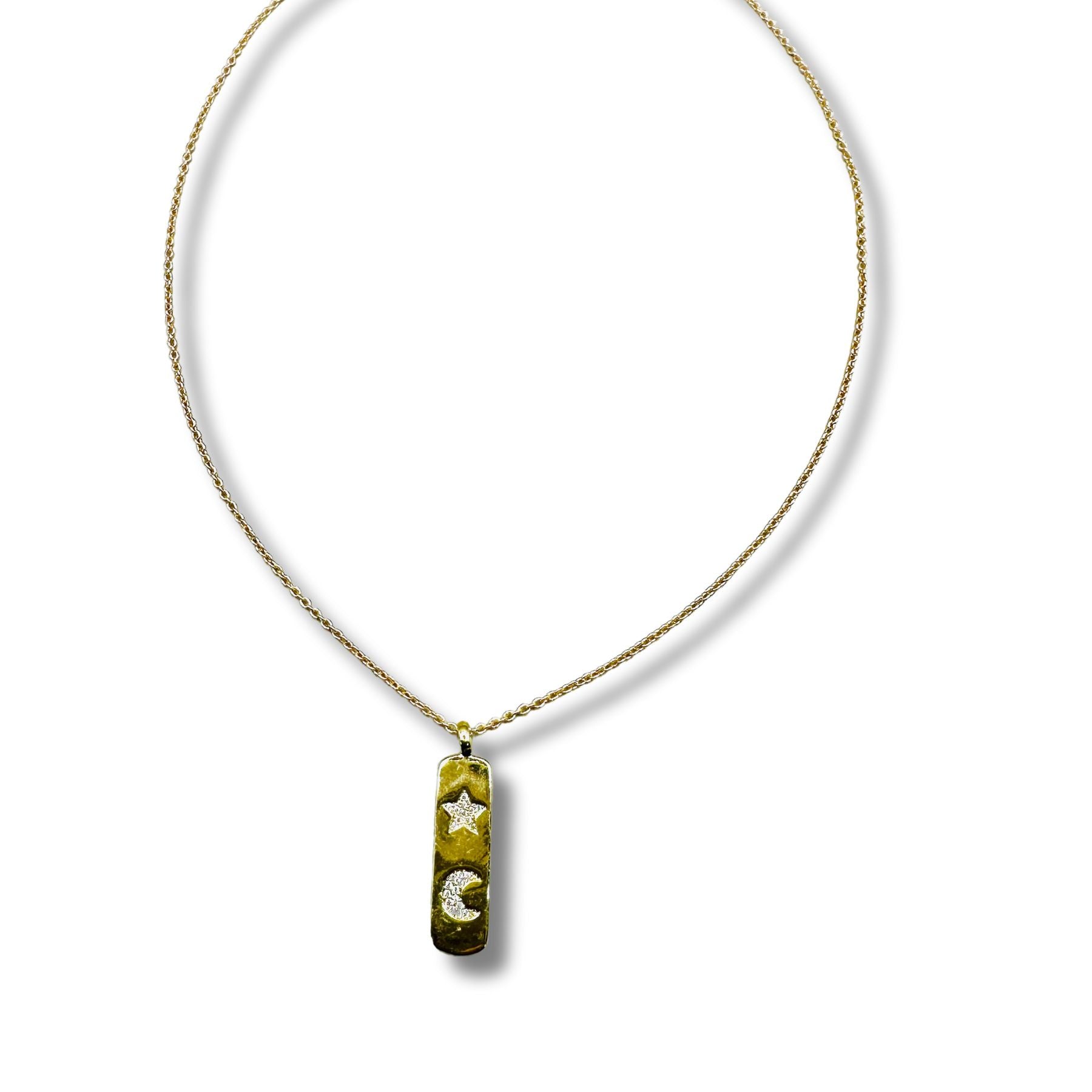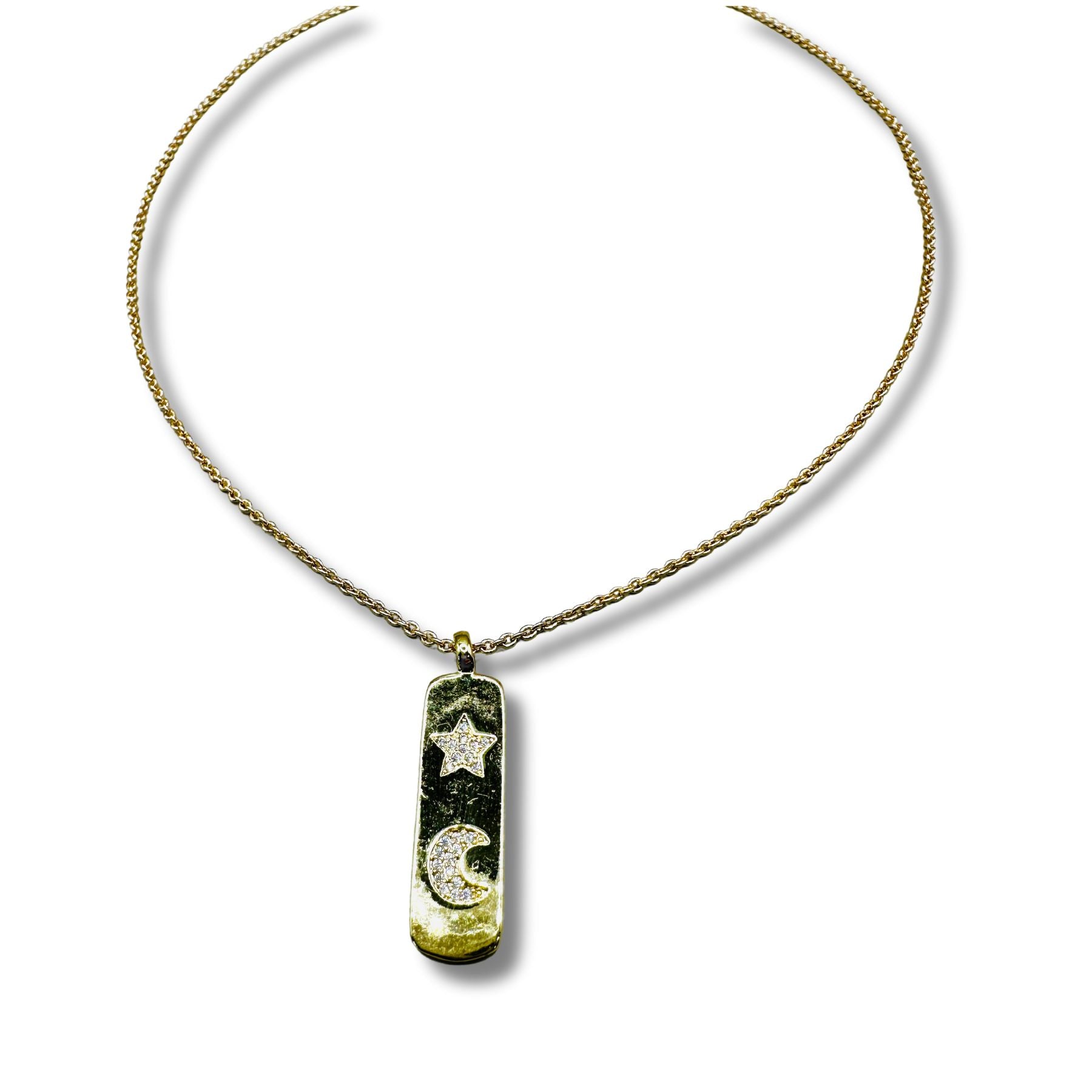 Embrace your inner star with this dazzling Pave Moon and Star Pendant Necklace! Featuring a beautiful bar pendant encrusted with sparkling cz stones, it's sure to add a little extra sparkle to all your looks. Perfect for everyday wear or a night out, it's the new constellation in your wardrobe collection. Shine on, star!