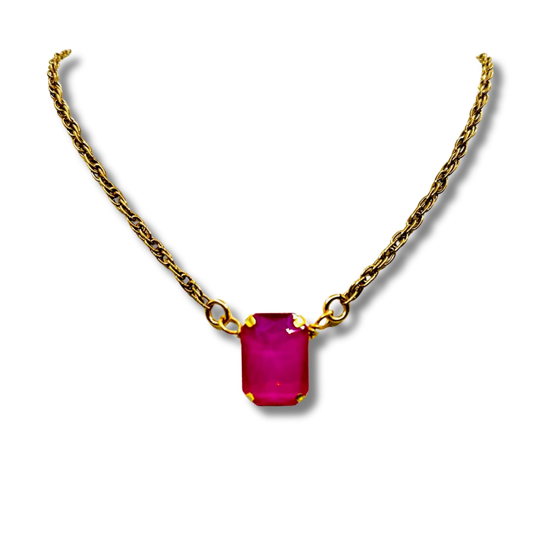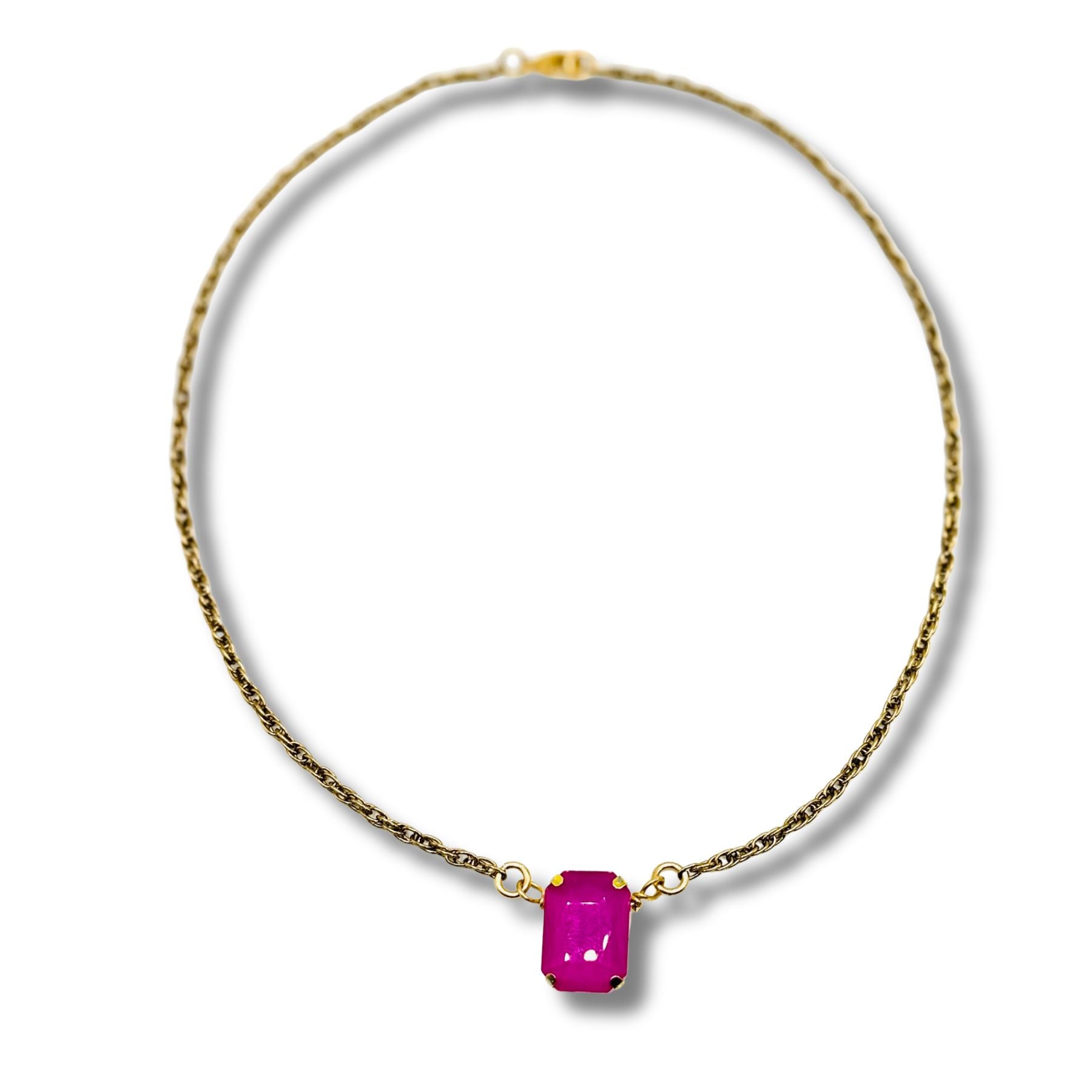 Introducing our Fuchsia Pink emerald cut Rhinestone Gold Statement Necklace, the ultimate accessory for adding a touch of luxury to any outfit. Made with a sparkling rhinestone, this necklace will make you shine like a diamond. Elevate your style with this elegant and exclusive piece.