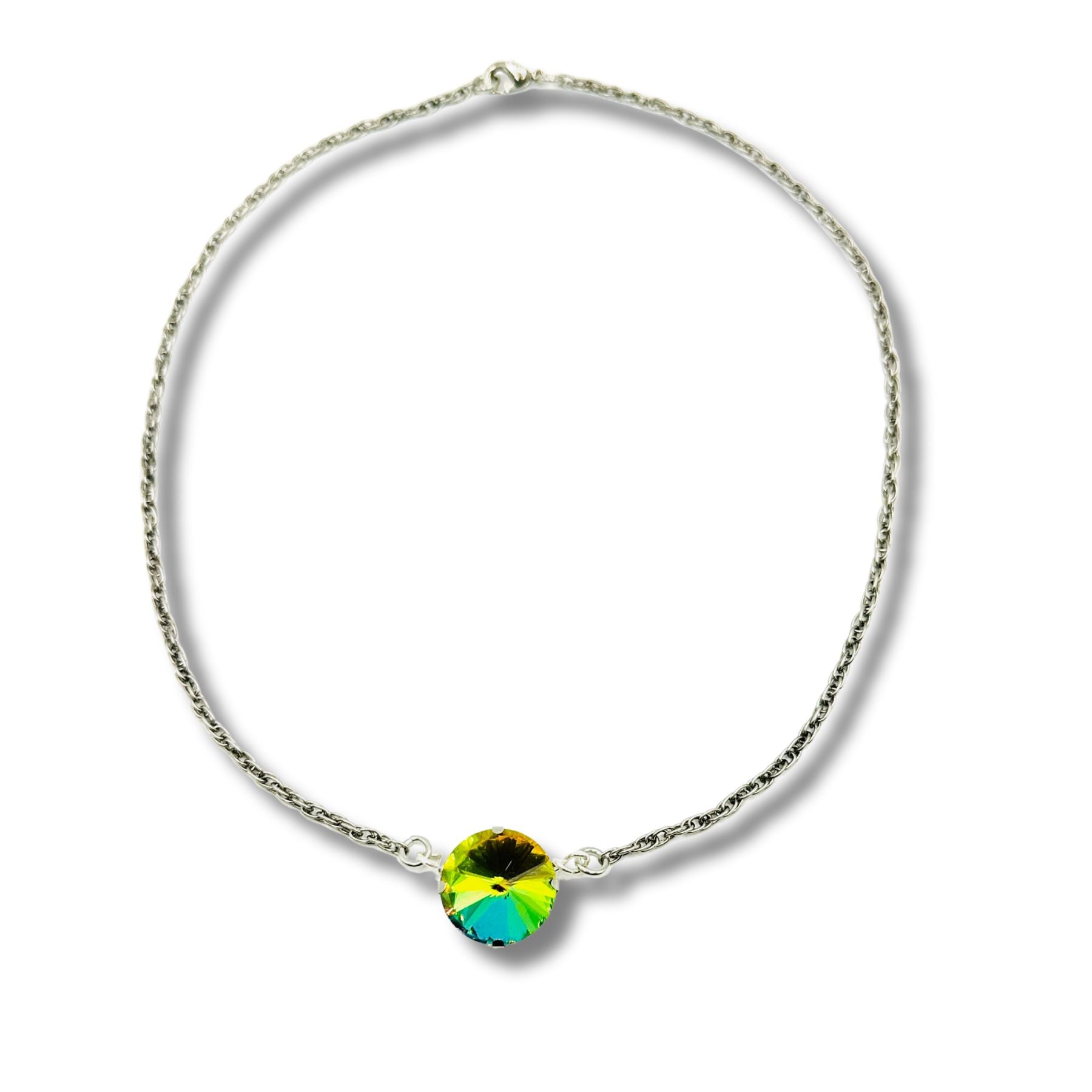 Introducing our Color Shifting Rainbow Rhinestone Silver Statement Necklace, the ultimate accessory for adding a touch of luxury to any outfit. Made with a sparkling color shifting rhinestone, this necklace will make you shine like a diamond. Elevate your style with this elegant and exclusive piece.