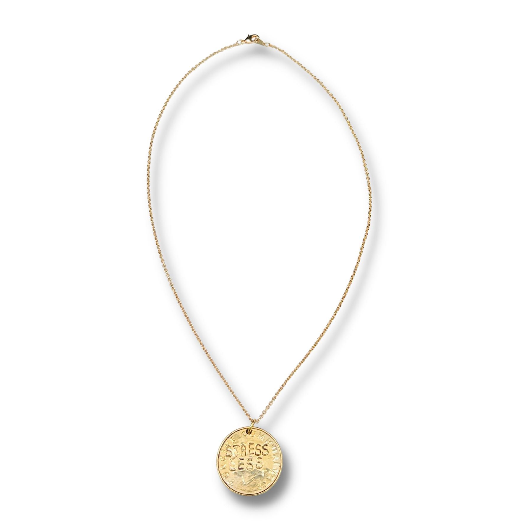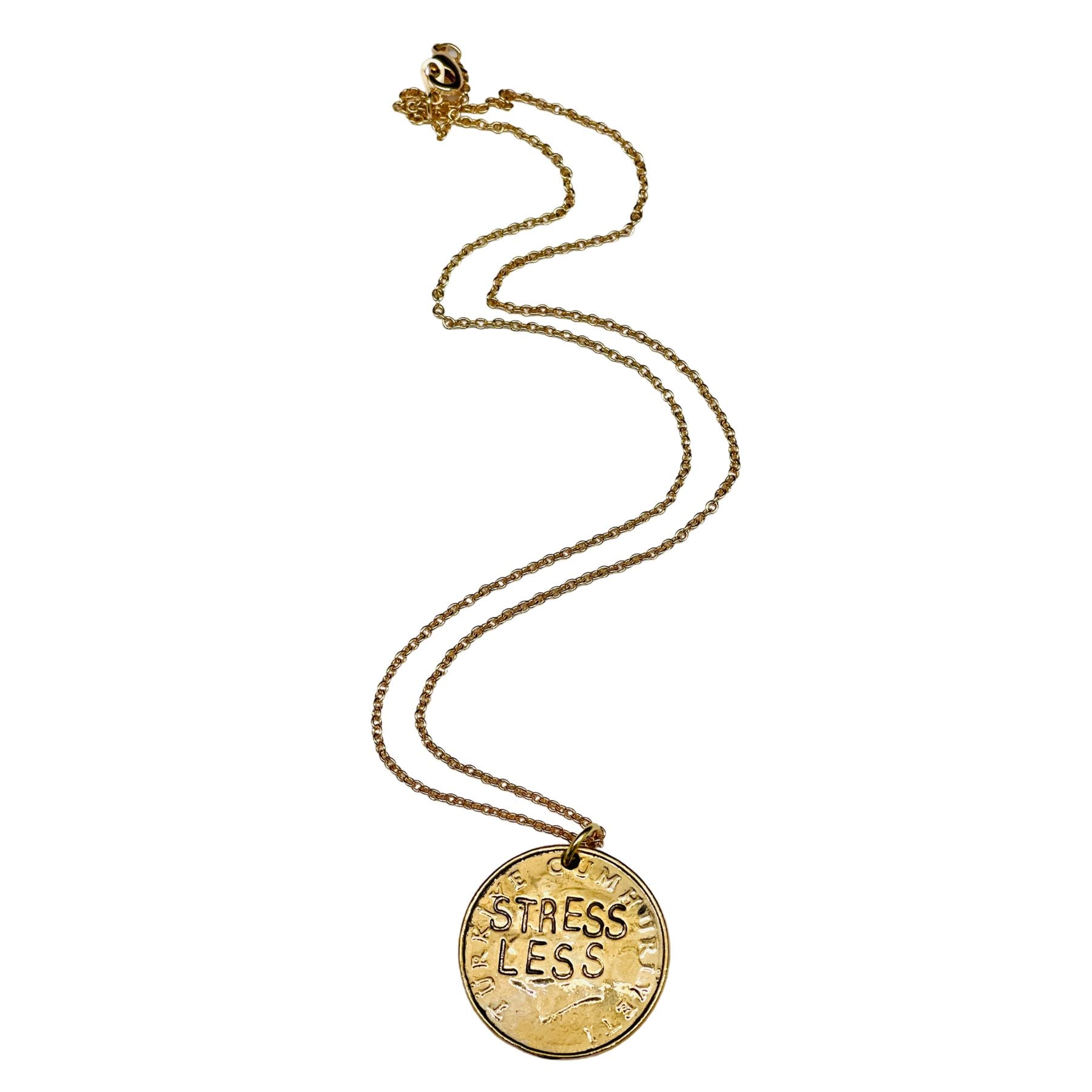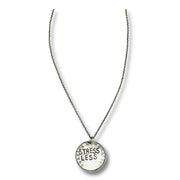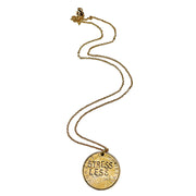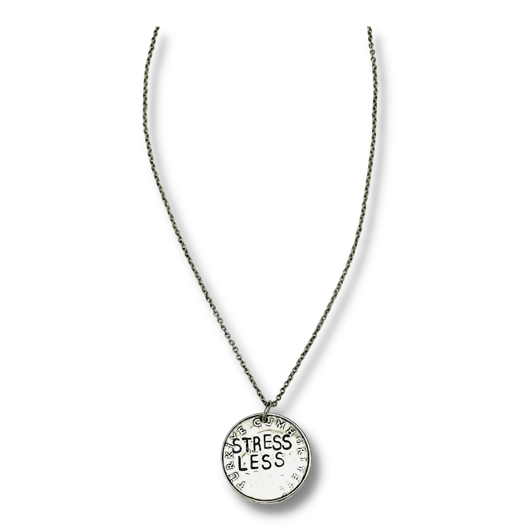 Discover tranquility with this Stress Less/Don't Panic hand stamped pendant necklace. The double-sided design will keep you inspired throughout the day, with "Stress Less" on one side and “Don't Panic” on the other. Wear this beautiful necklace around your neck and feel empowered to conquer anything.