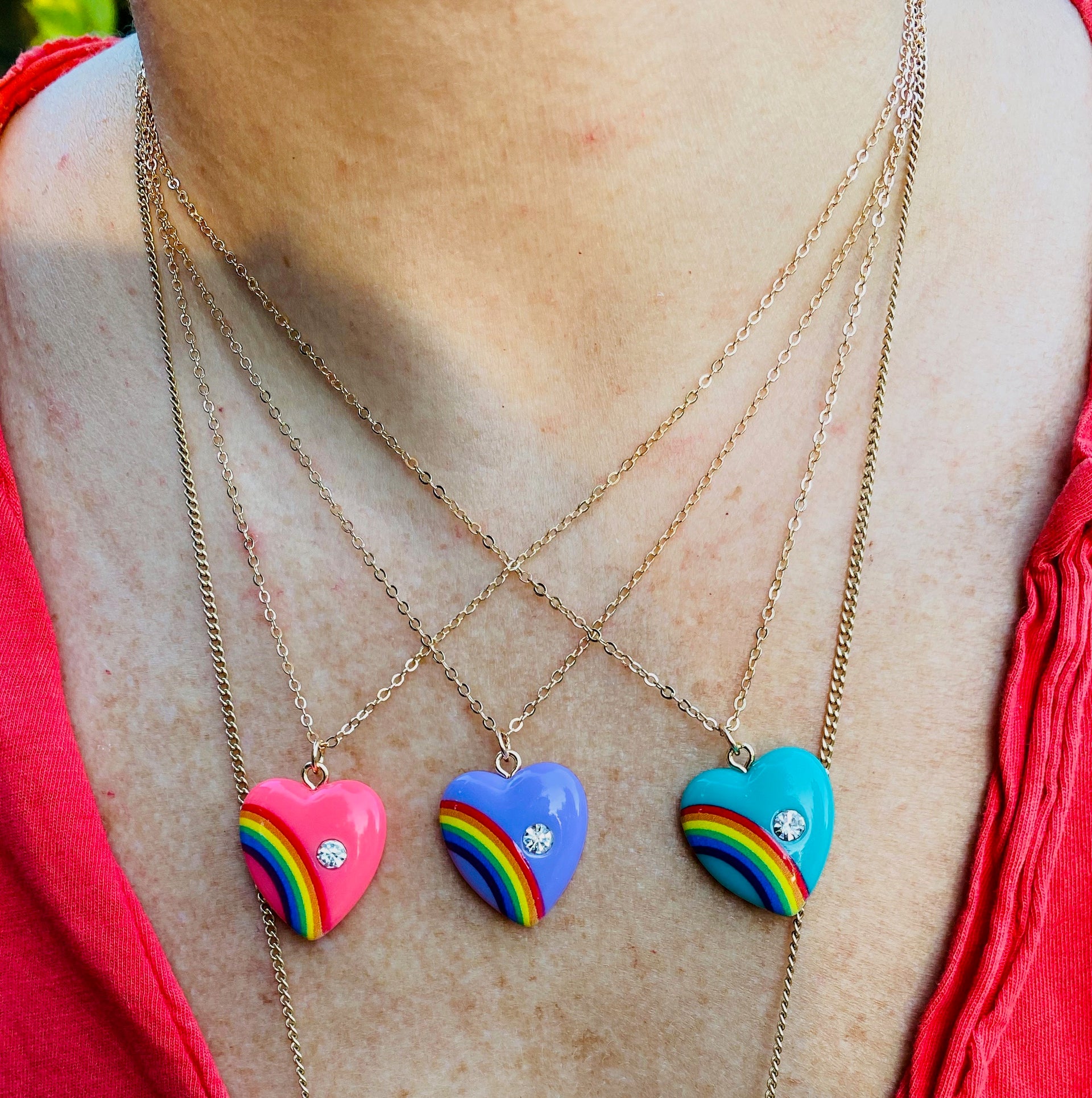 Experience the retro-chic style of our Large Size Vintage inspired Rainbow Heart Necklace! Crafted in vibrant acrylic and embedded with a darling rainbow and rhinestones, this statement piece will make heads turn with its unique and playful design - available in seven different colors. Its 18" gold-plated, brass chain provides a luxurious finish, while the heart measures in at 1" in length and 3/4" in width. Make a bold, fashionable statement with this one-of-a-kind piece!