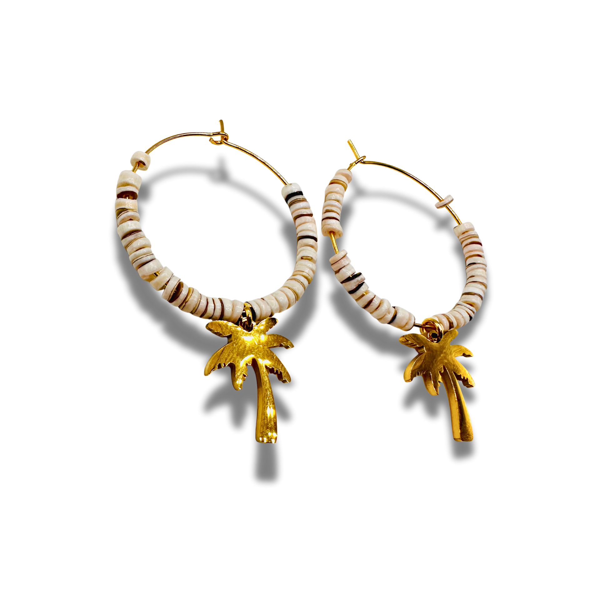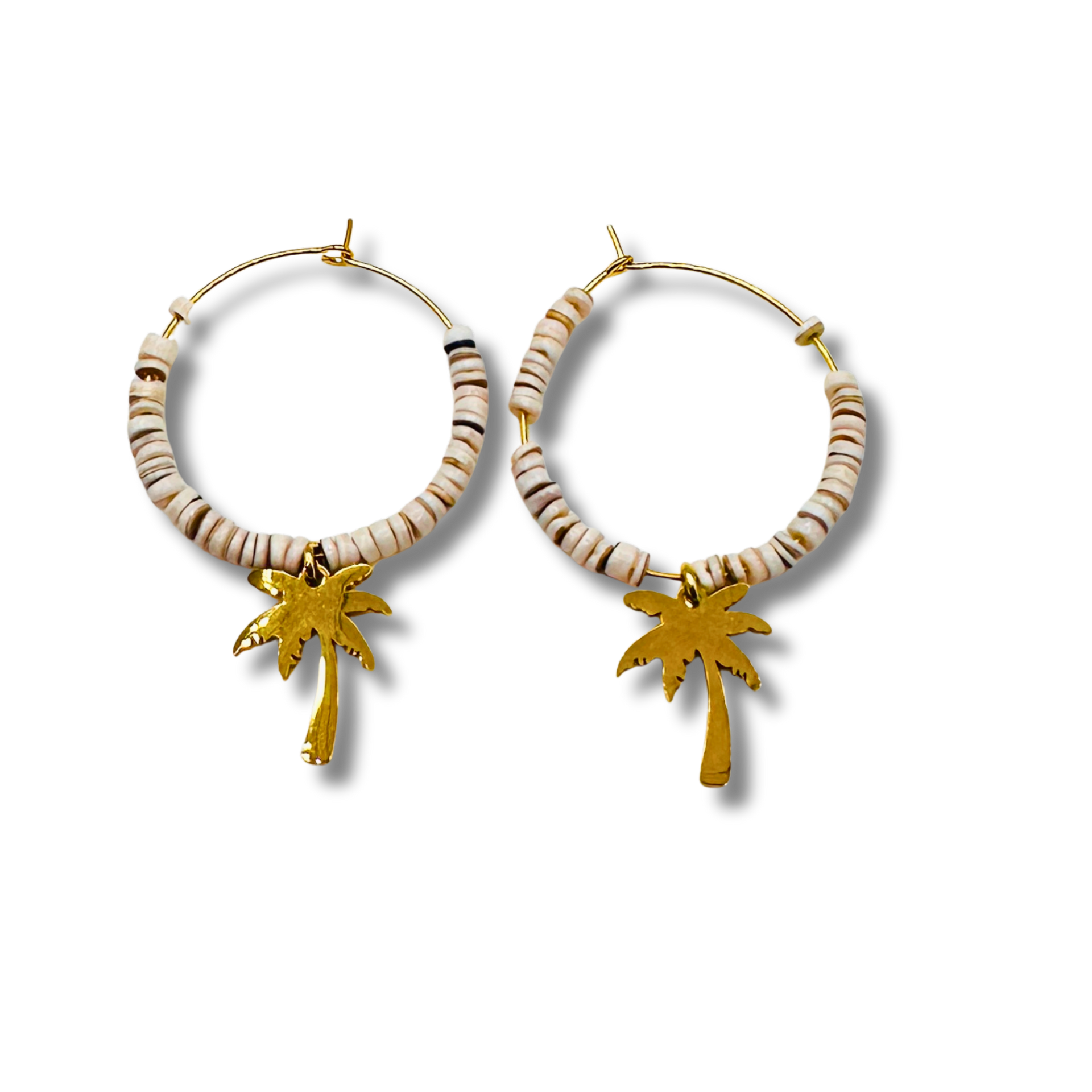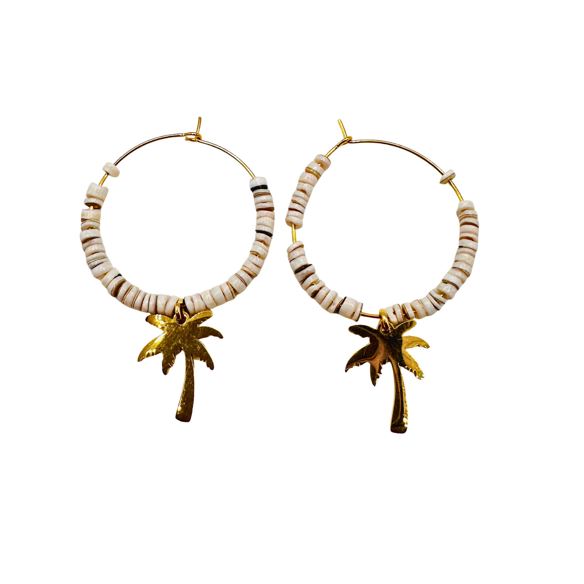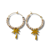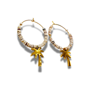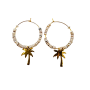 Effortless and sun inspired, the Beach Dreaming hoops bring a touch of coastal charm to your everyday look. Crafted with 1" 14kt gold plated brass hoops, each earring is accented with a plated brass palm tree charm and shell beads that add texture and movement. Lightweight and easy to wear, these hoops capture the feeling of warm days, ocean air, and carefree moments. Perfect for vacation or bringing beach vibes wherever you are.
