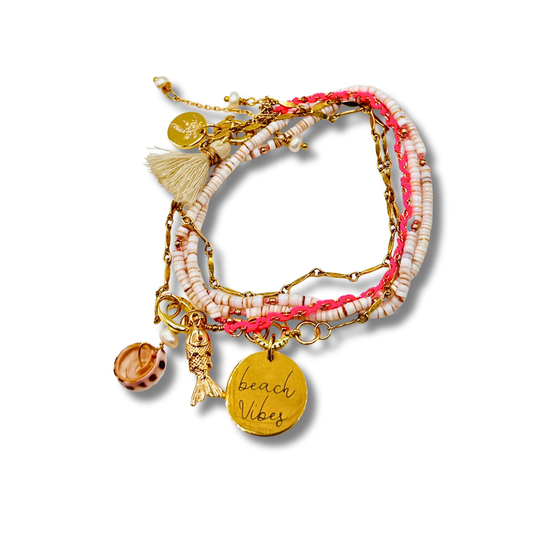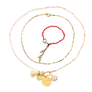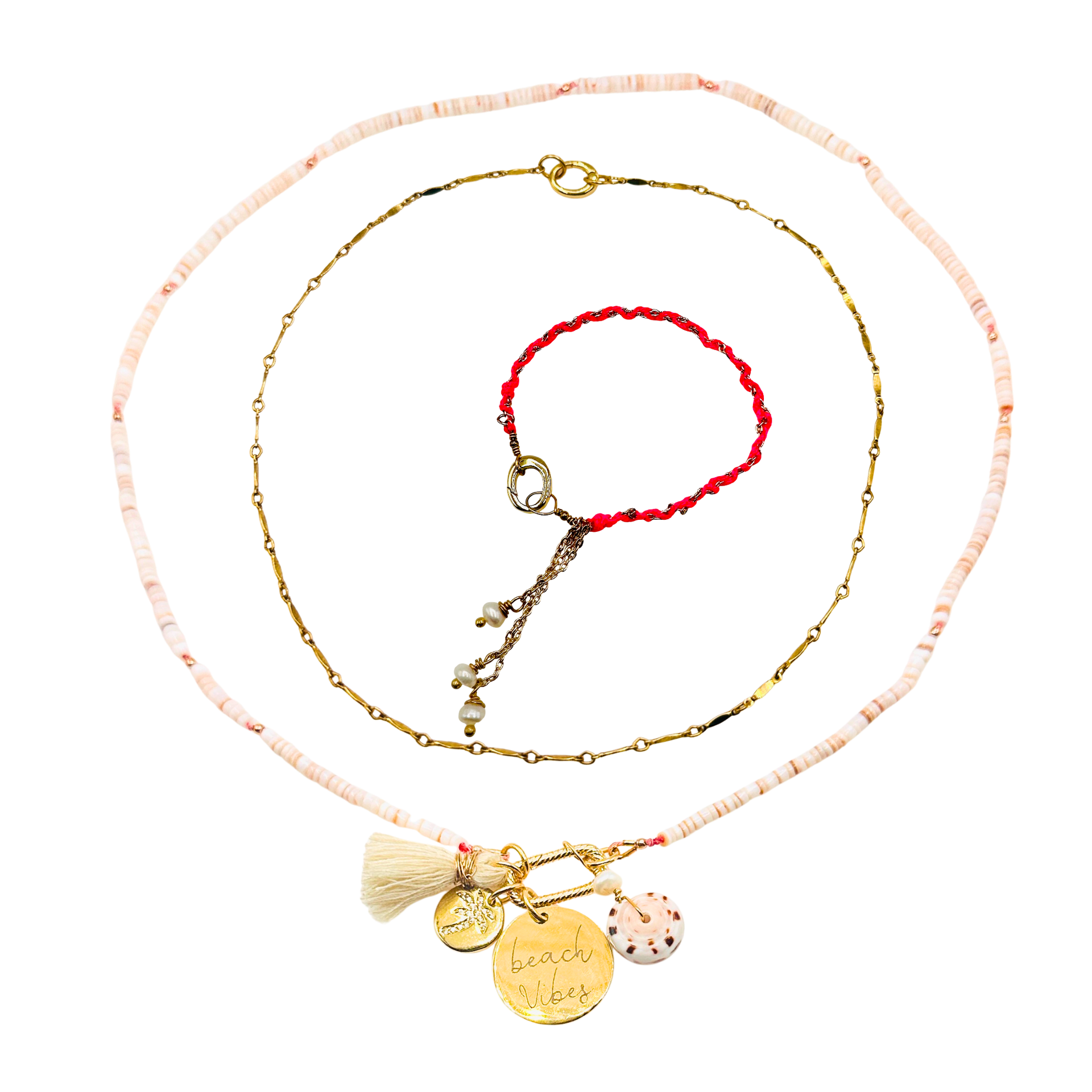 Easy, sun soaked, and made for mixing and matching, the Beach Vibes Convertible is a playful set inspired by carefree coastal days. A 16" hand knotted shell bead necklace brings natural texture, paired with an 18" gold plated brass chain for a touch of shine. The hot pink cord and chain braided bracelet, finished with pearls, adds a bold pop of color and can be worn on its own or connected to the necklace pieces.