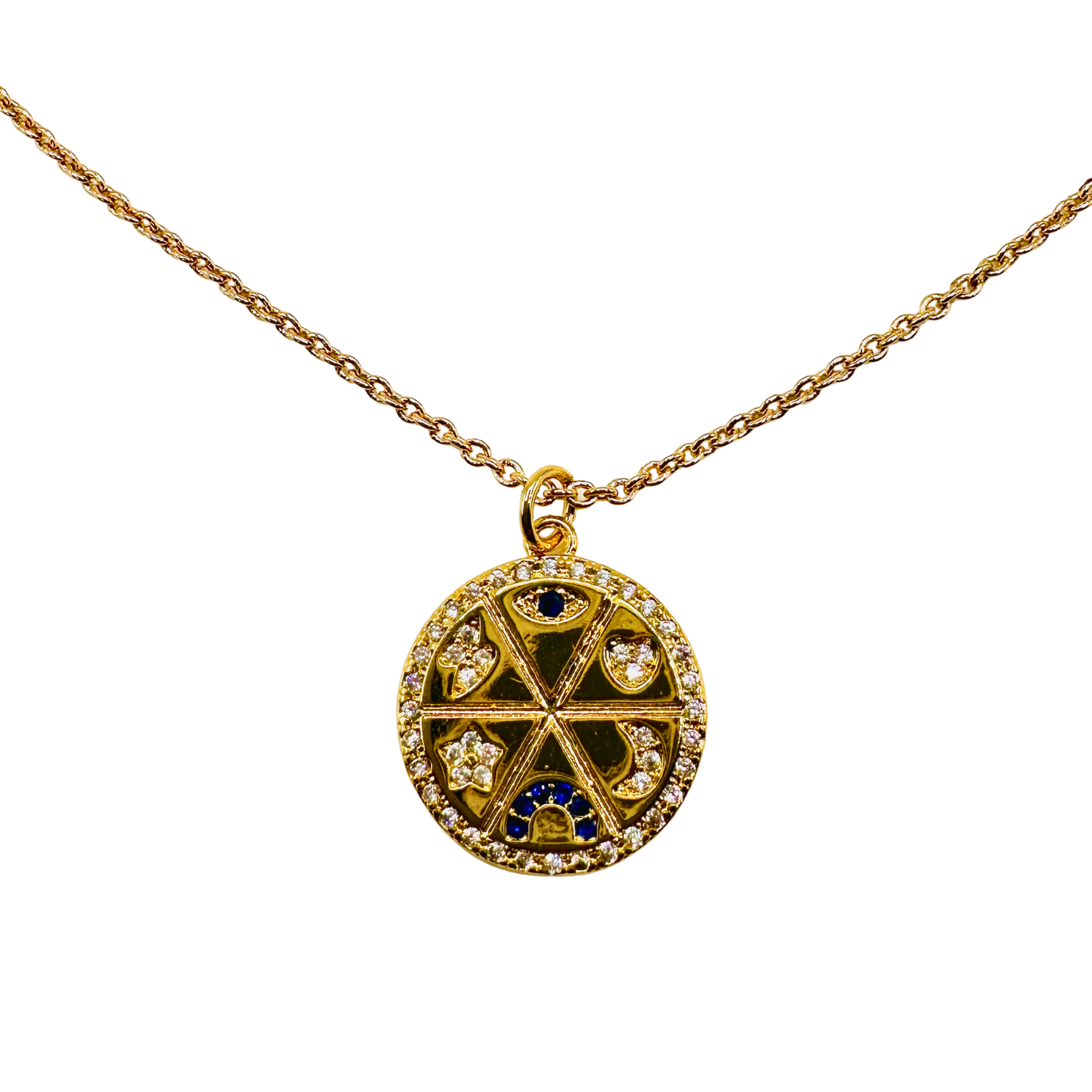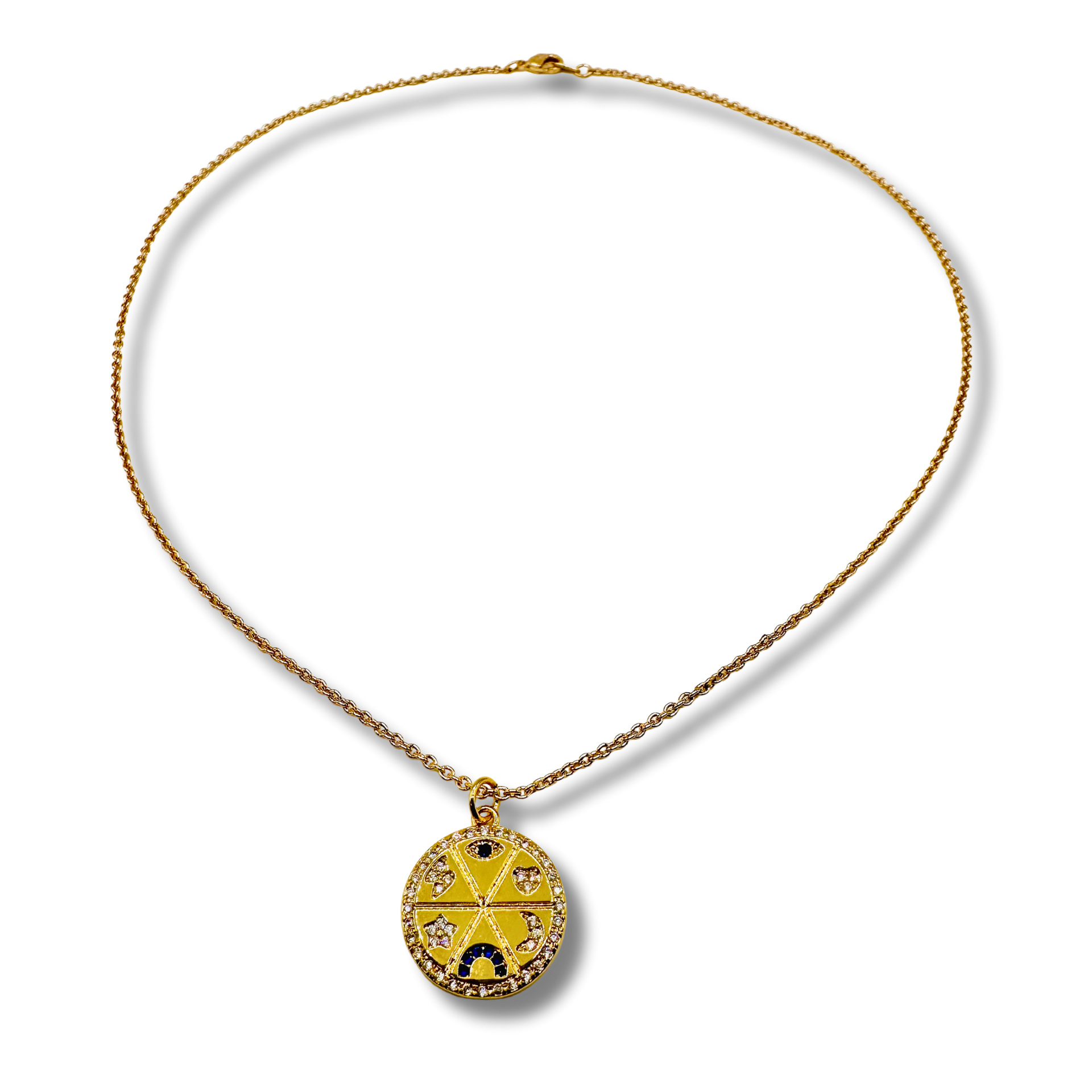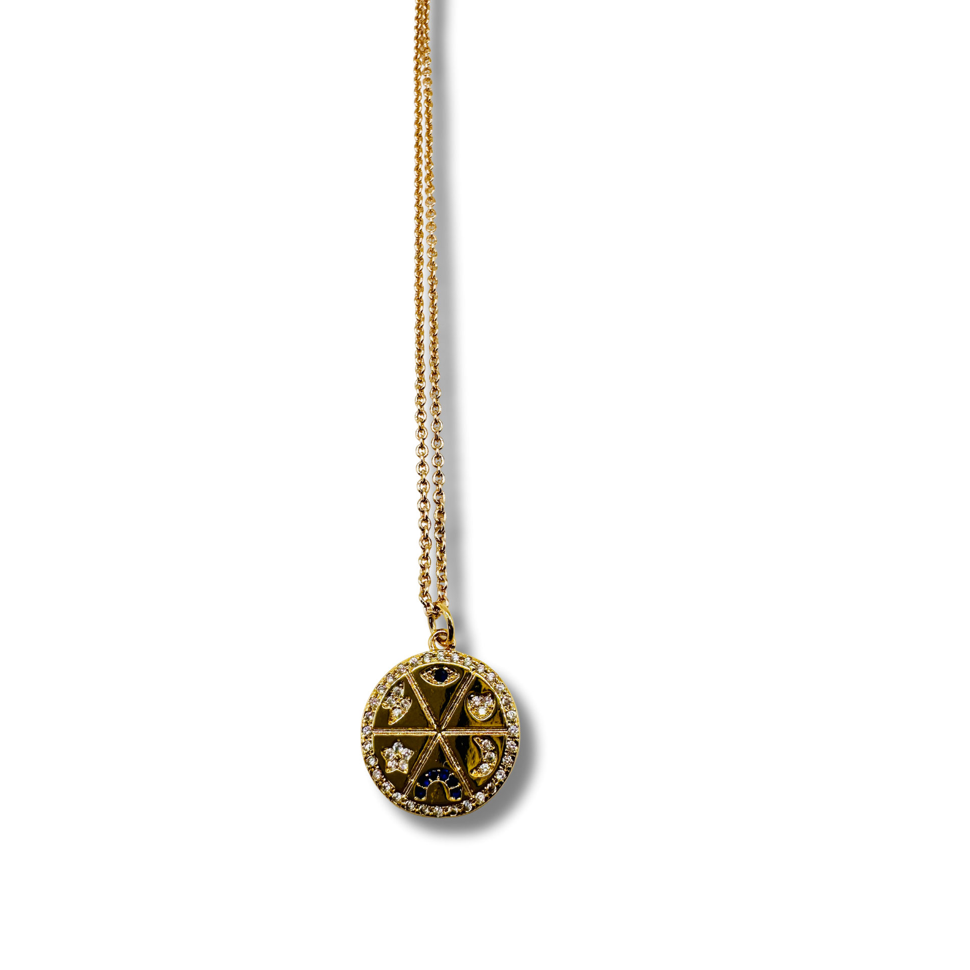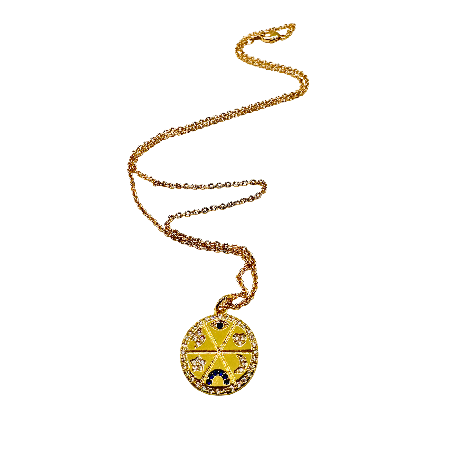 Designed to attract good energy and meaningful moments, this lucky symbols charm necklace brings together timeless icons of protection, fortune, and positivity. Each charm tells its own story, creating a piece that feels personal and powerful. Crafted in 14kt gold–plated brass and set on a 16" chain, it’s perfect for everyday wear or layering. A modern talisman to keep luck, intention, and optimism close wherever you go.