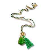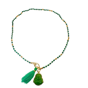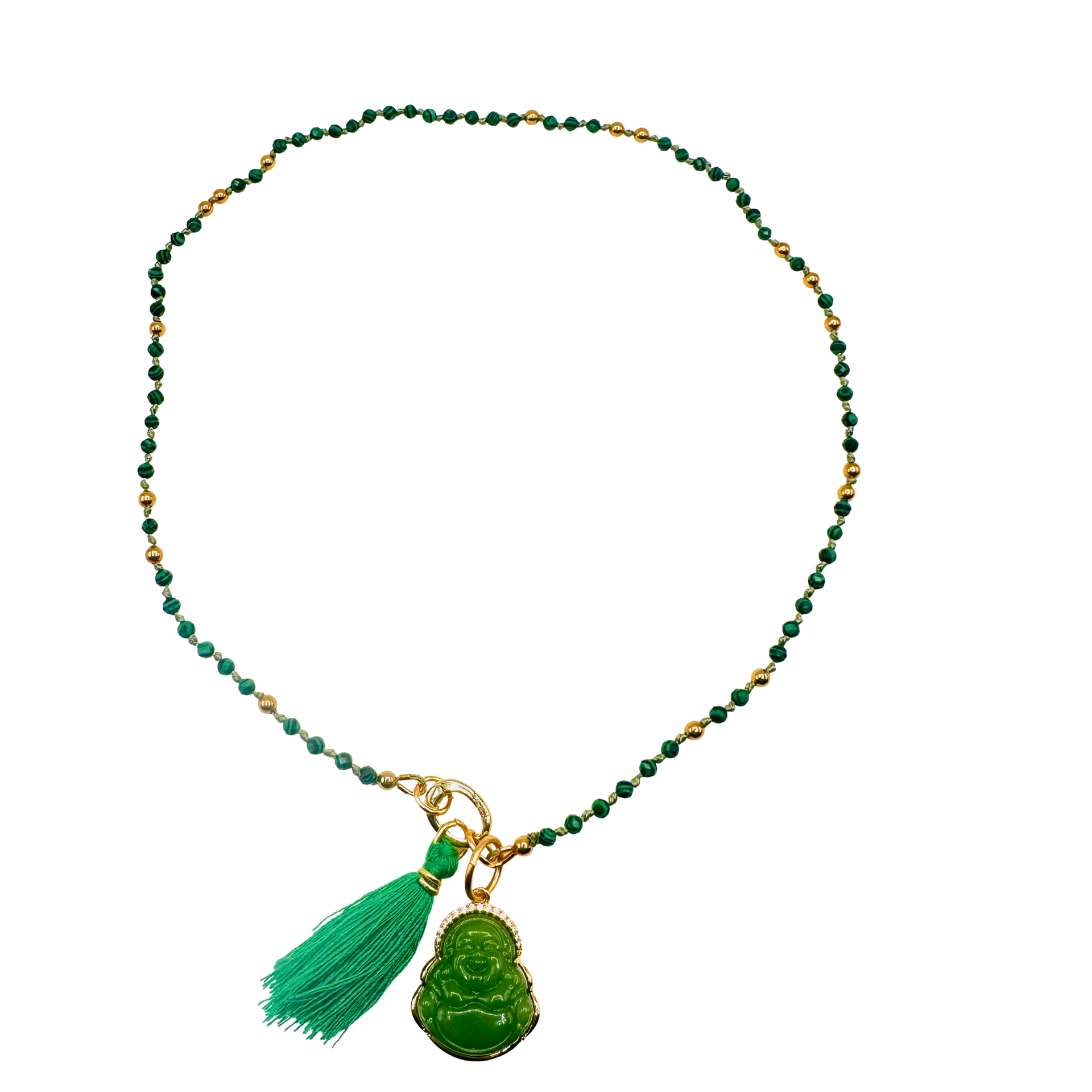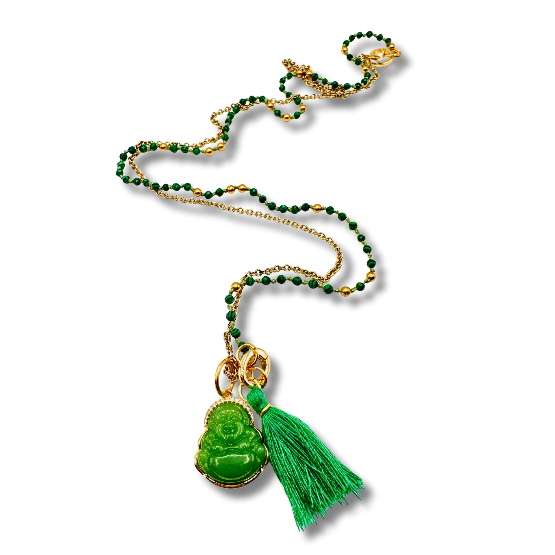 The Good Luck Buddha Necklace is designed to attract positivity, protection, and abundance. Featuring a green glass pave Buddha charm, a hand knotted malachite and brass chain, and a 14KT gold plated brass chain, this piece blends spiritual meaning with elevated everyday style. Malachite is known as a stone of transformation and good fortune, while the Buddha symbolizes peace, luck, and mindful living.