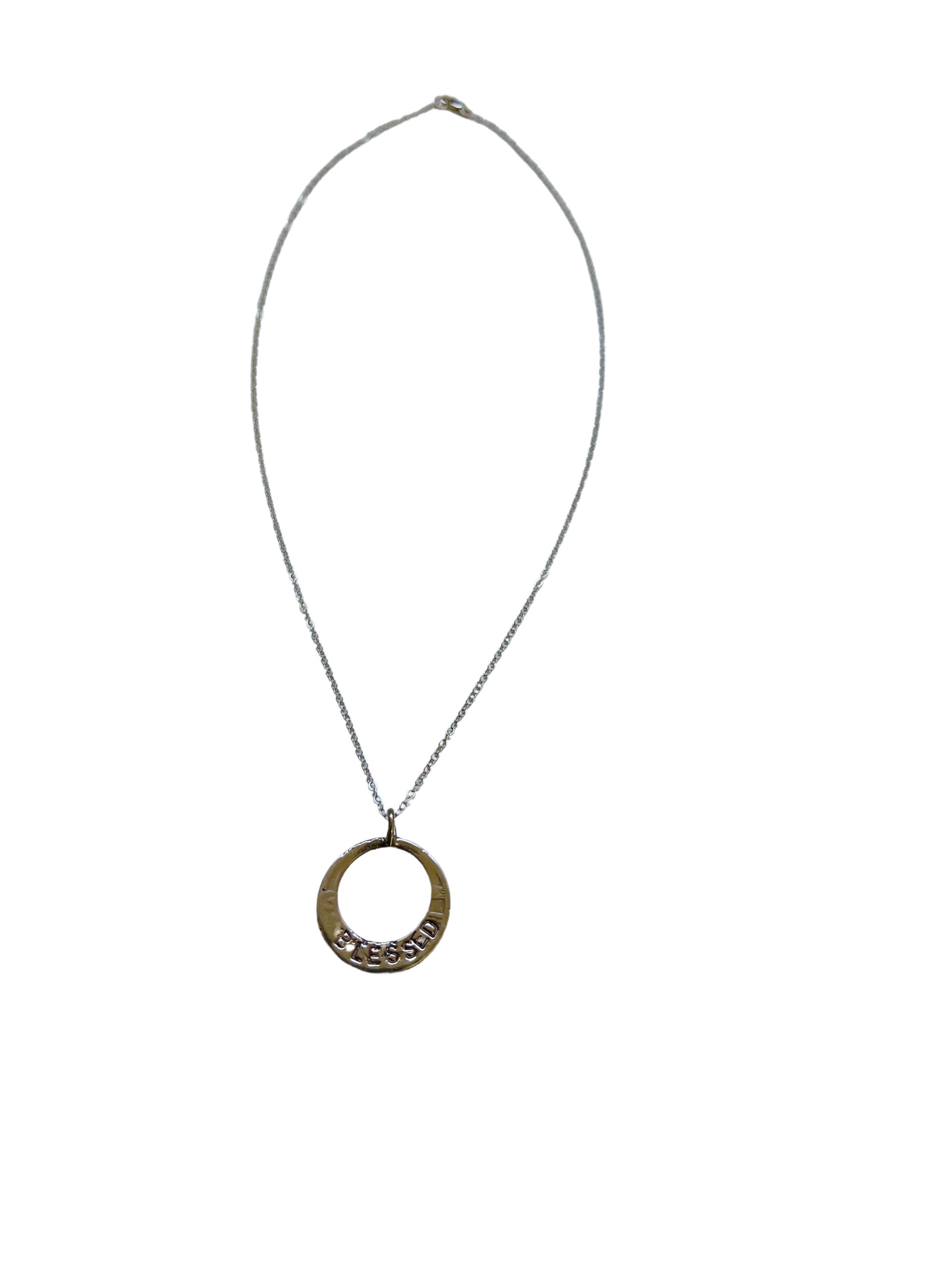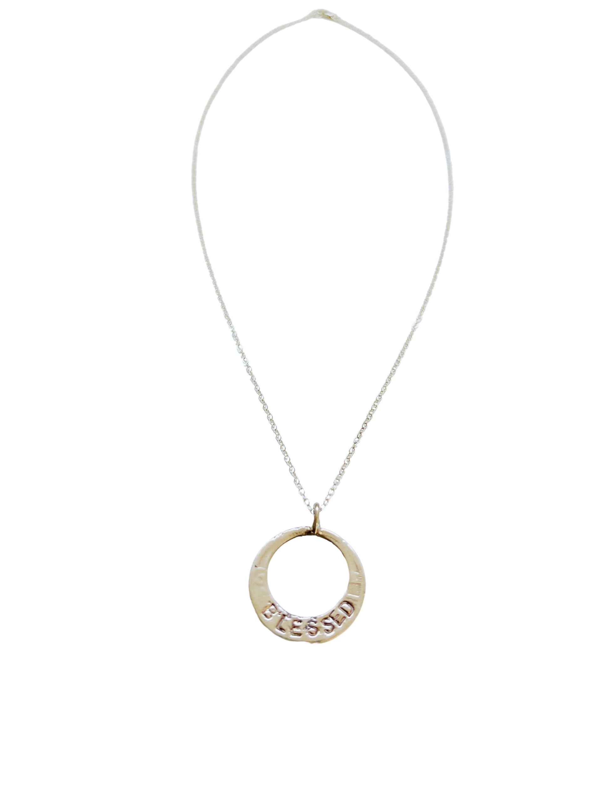 Sterling silver dainty chain with sterling clasp. 18” the white brass pendant is a again from our luxury collection. It was made from a coin and we stamped blessed.
