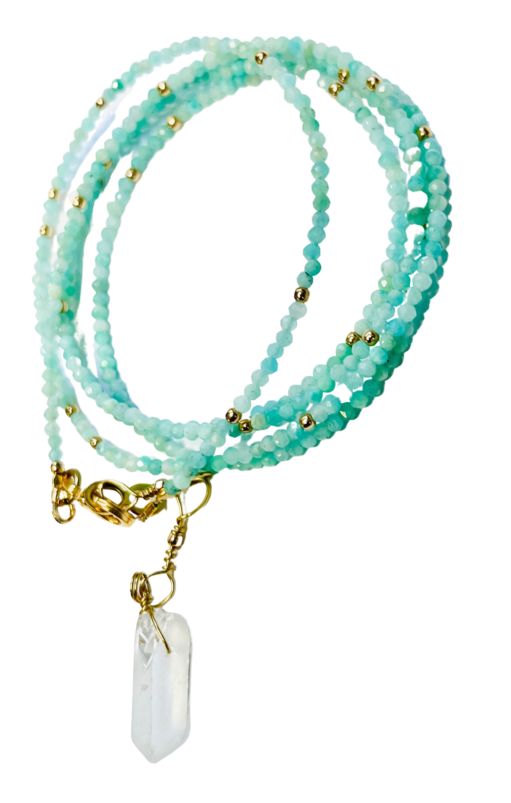 Amazonite 32" with extender and clear crystal point. gold filled beads