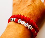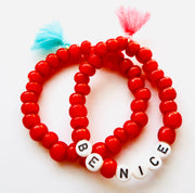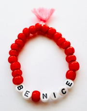 Hand beaded bracelets are all of the rage! Especially ones with a message incorporated. The beads are glass African beads which are vibrant in color and mismatched in size. Each bead is unique and make this bracelet a piece to treasure. This piece has a pink and blue handmade tassel. This is a set of two.