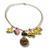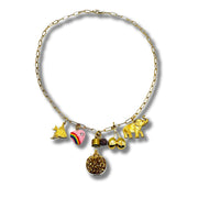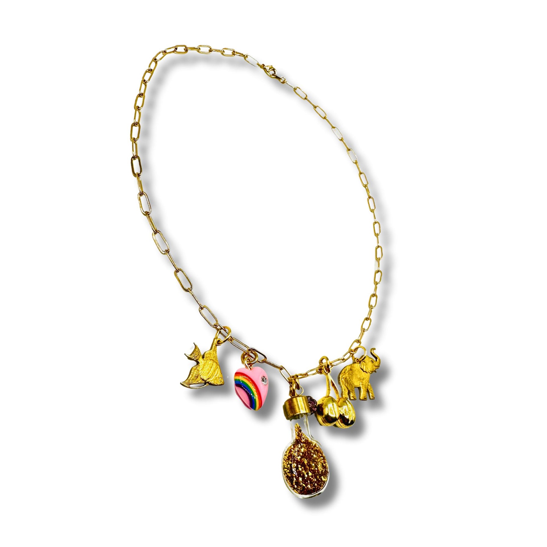 Add a touch of whimsy to any outfit with our Wish Upon a Rainbow Charm Conversation Necklace. Featuring a colorful rainbow charm and a glass bottle filled with glitter, this necklace also includes unique brass accents like a fish, cherries, and an elephant. The 18" 14kt gold brass chain adds a delicate touch to this playful accessory.