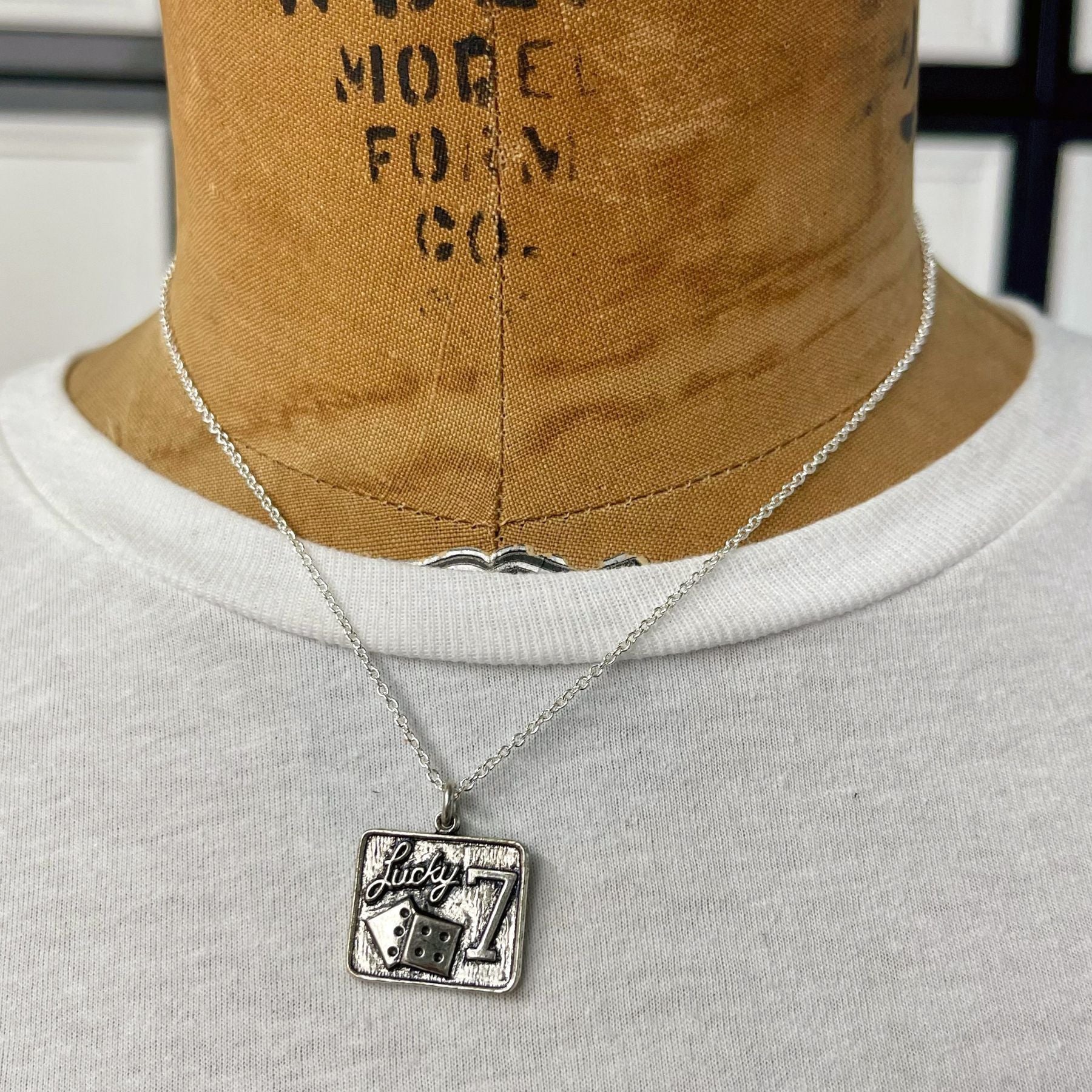- Lucky 7 necklace is available in gold or silver plated pewter