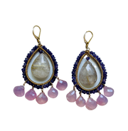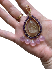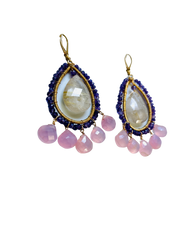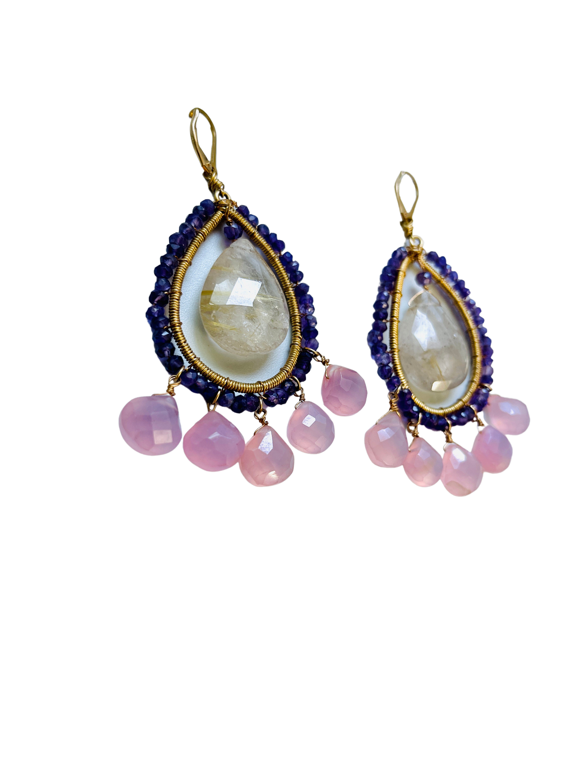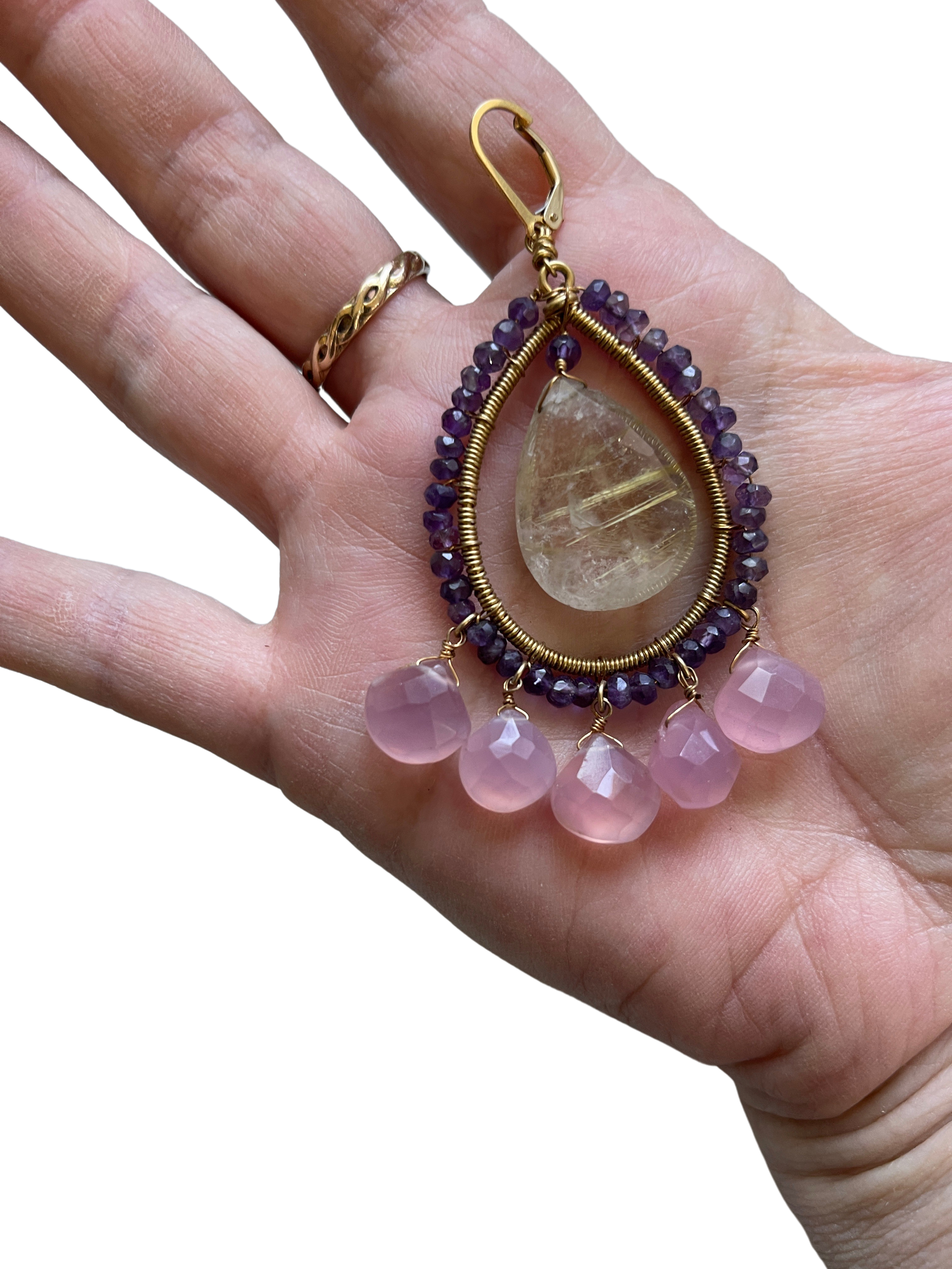 Now these are amazing! They measure about 3” and are all hand wire wrapped. 14kt gold lever back hooks. The stones are garnets and lavender quartz briolettes.