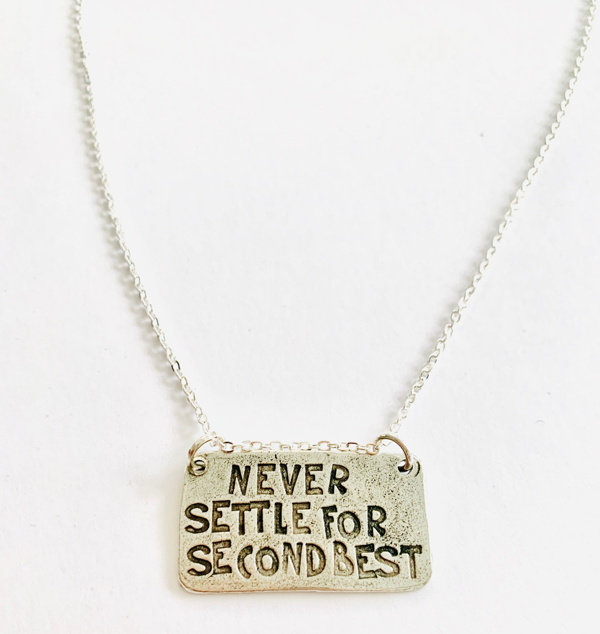 For those who never accept anything but the best, this sophisticated necklace is the perfect accessory. Crafted of sterling silver, it features a bar stamped with "Never settle for second best" -- a powerful statement that encourages confidence, ambition, and excellence. Wear it for a luxurious look that inspires daily.