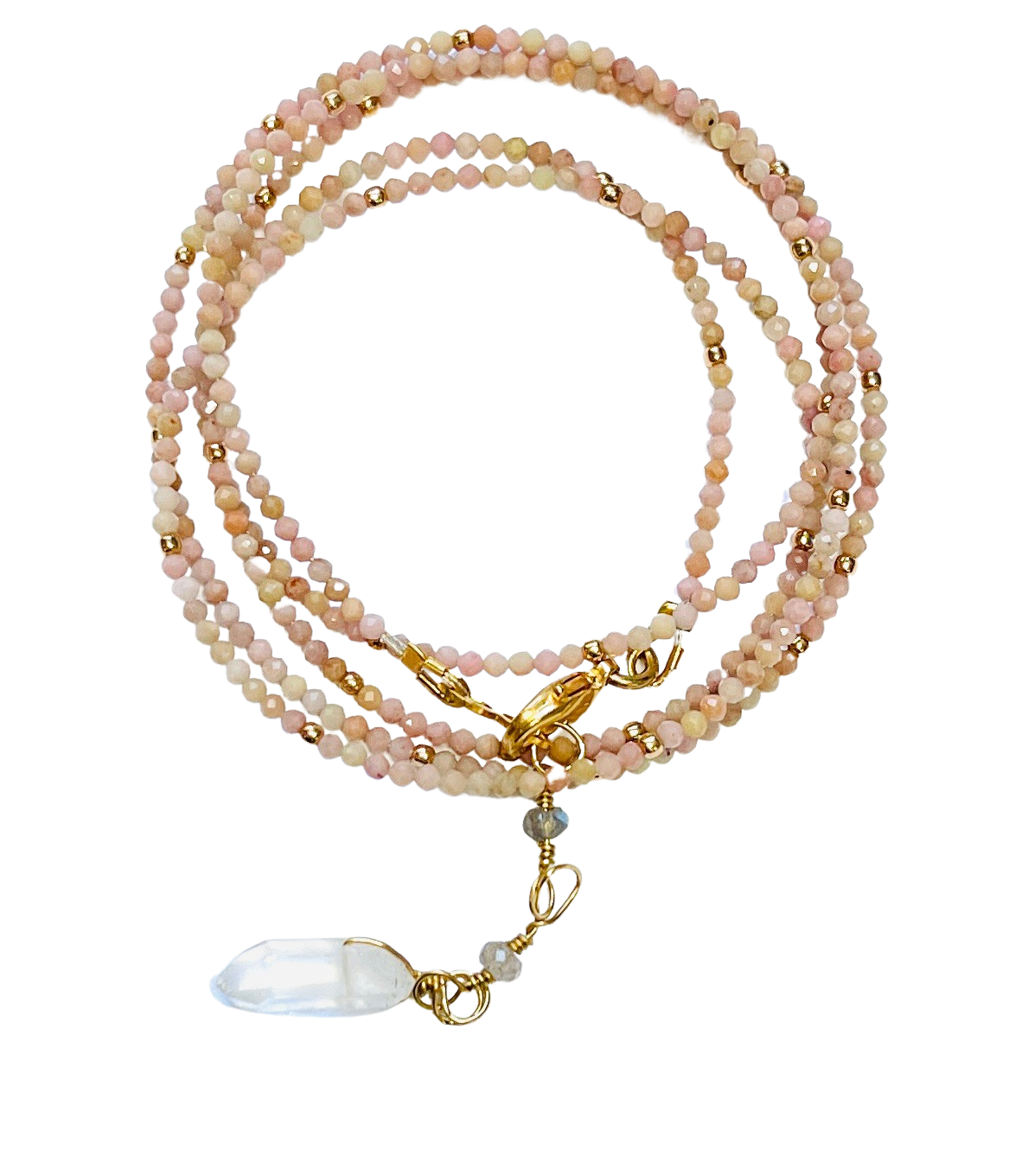 Rhodonite 32" with extender and clear crystal point. gold filled beads