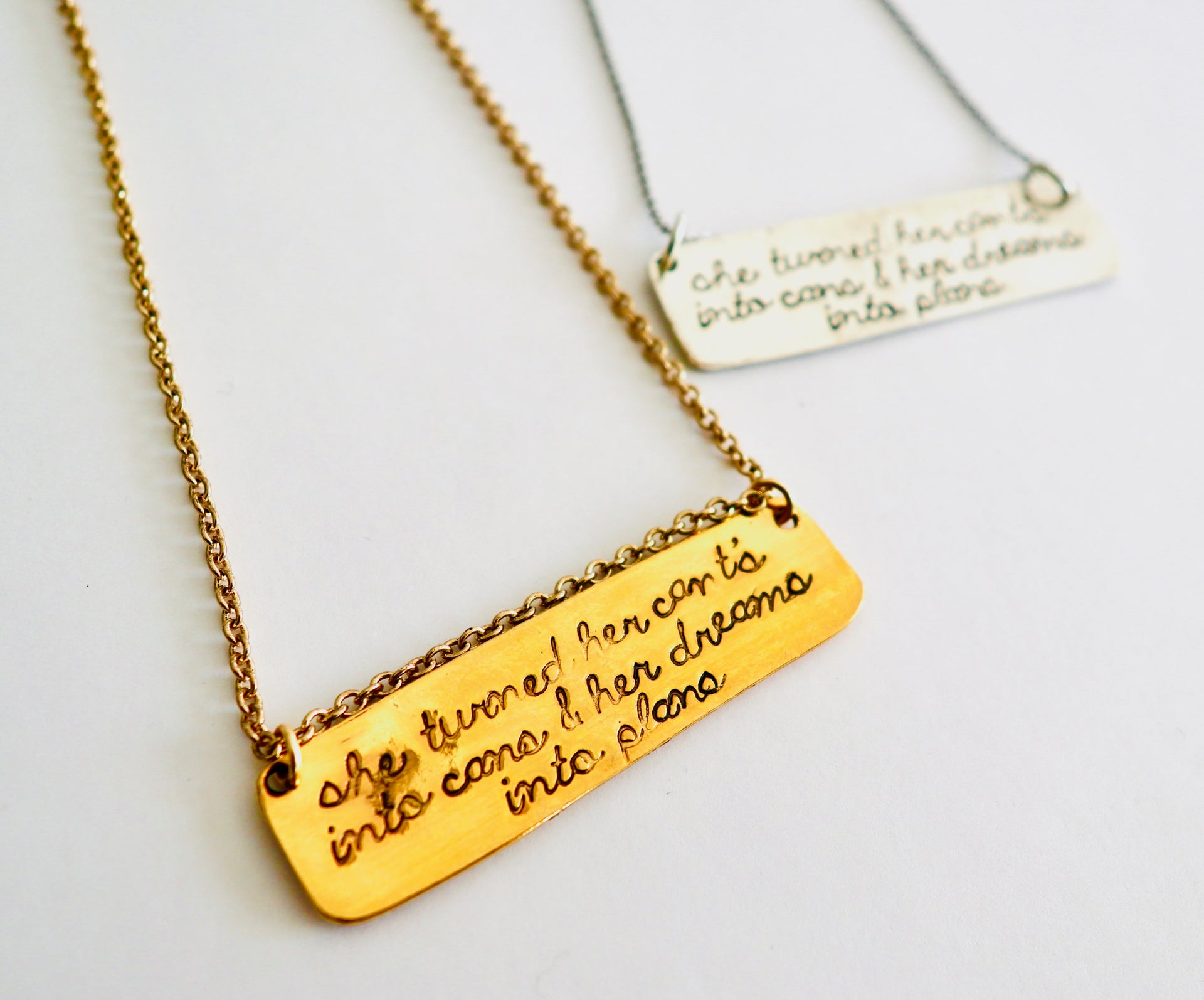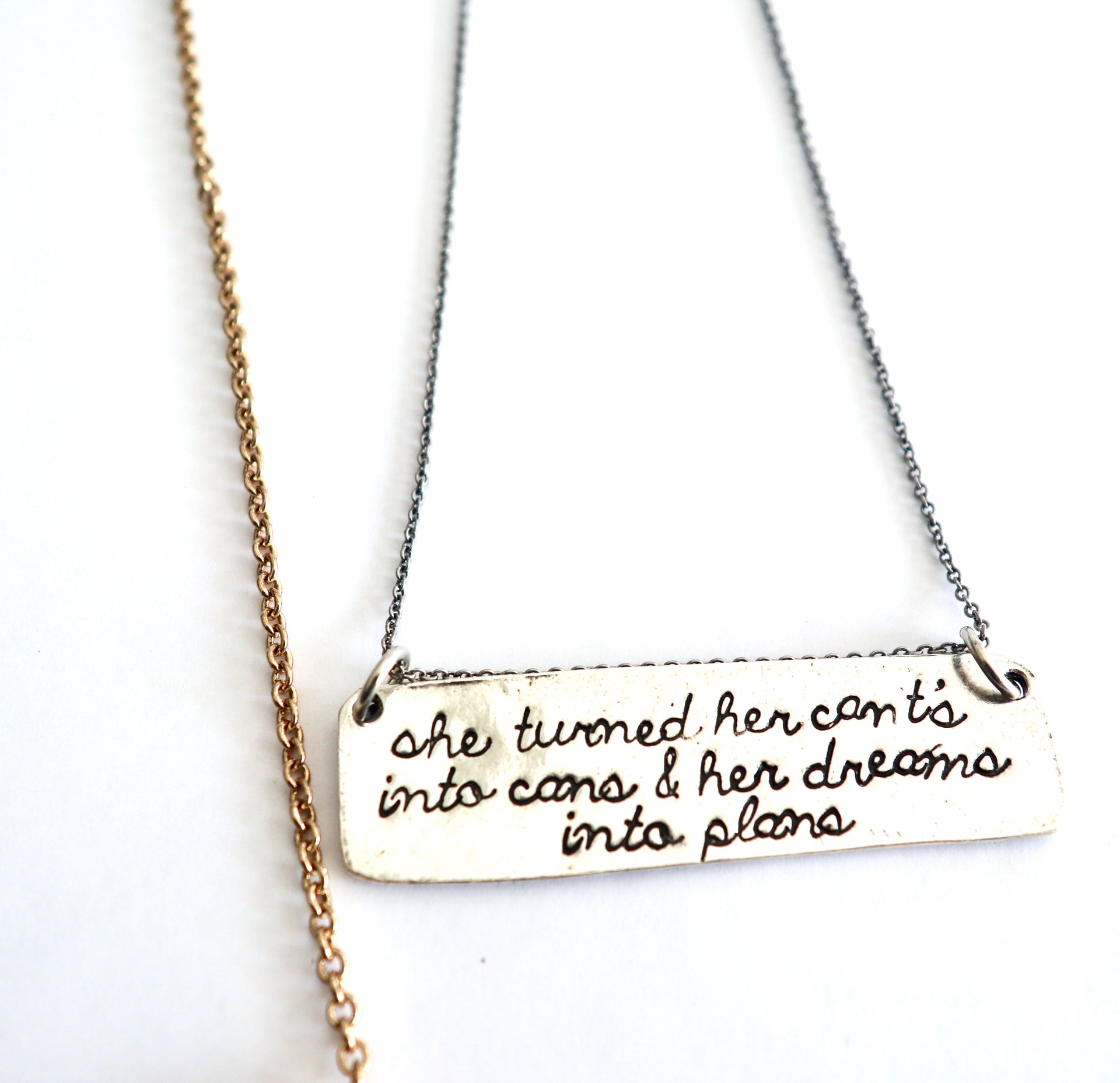 Remind yourself of all you've accomplished with this charming "She Turned Her Cant's Into Cans" necklace! Each necklace is individually hand-stamped, keeping each piece unique and special — just like you!