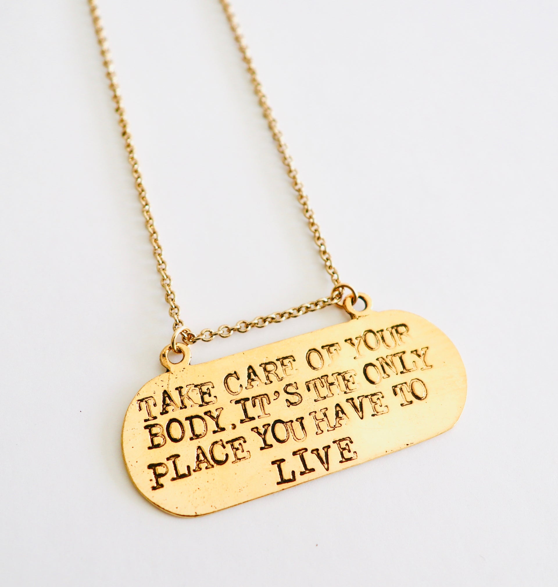 Accentuate your look with this unique necklace! Lovingly stamped with the words ‘take care of your body - it's the only place you have to live', it will remind you of the importance of self-care and will bring an inspiring pop of style to any outfit.
